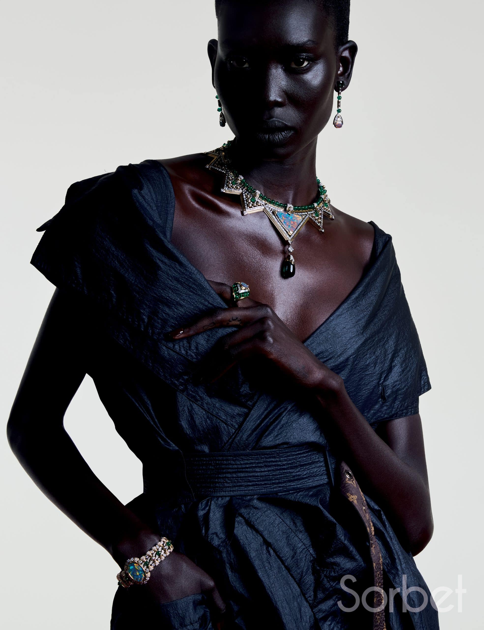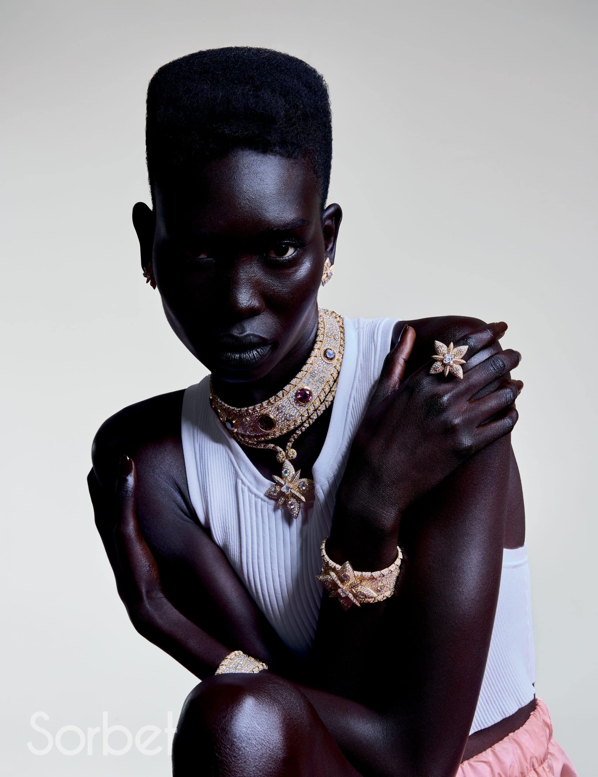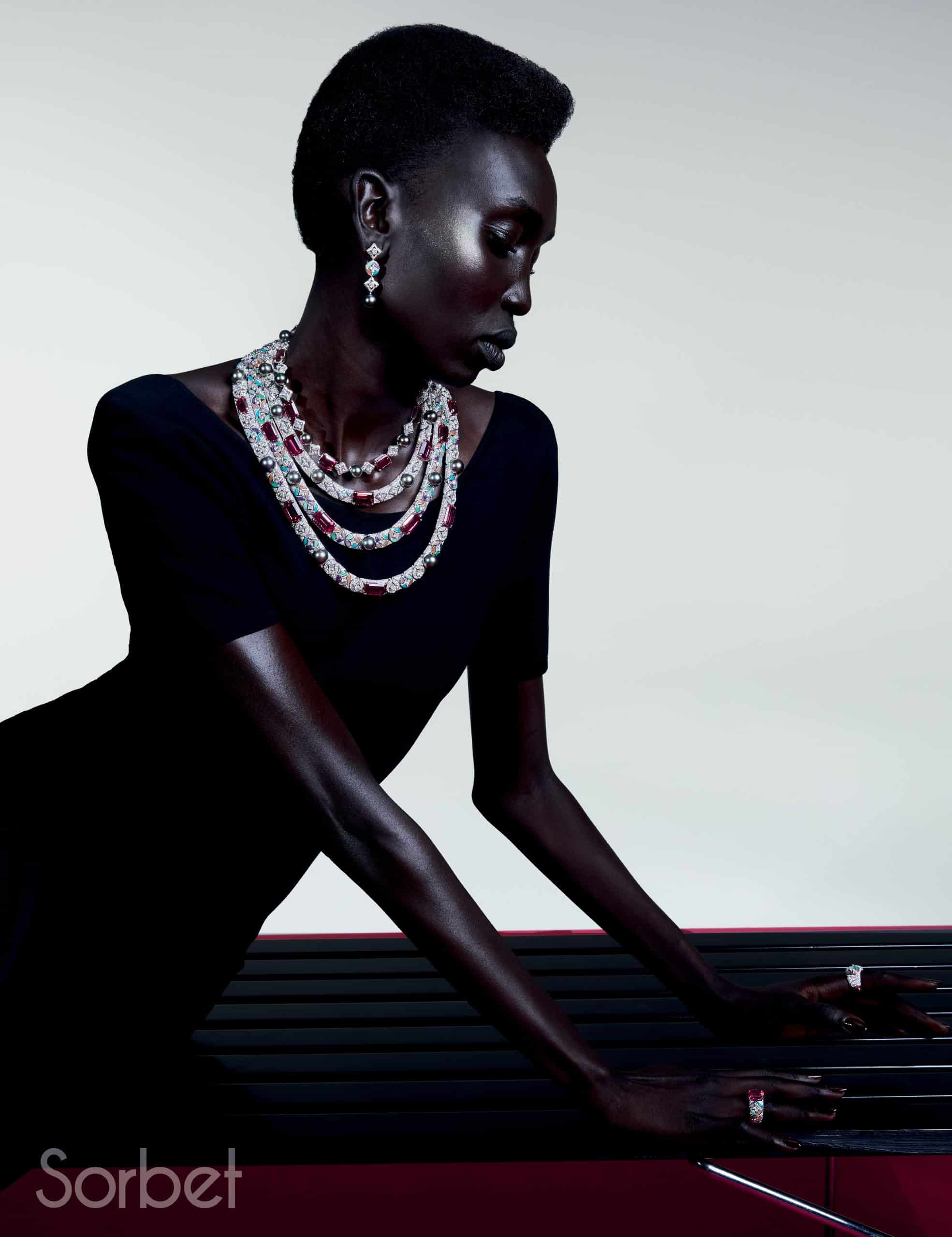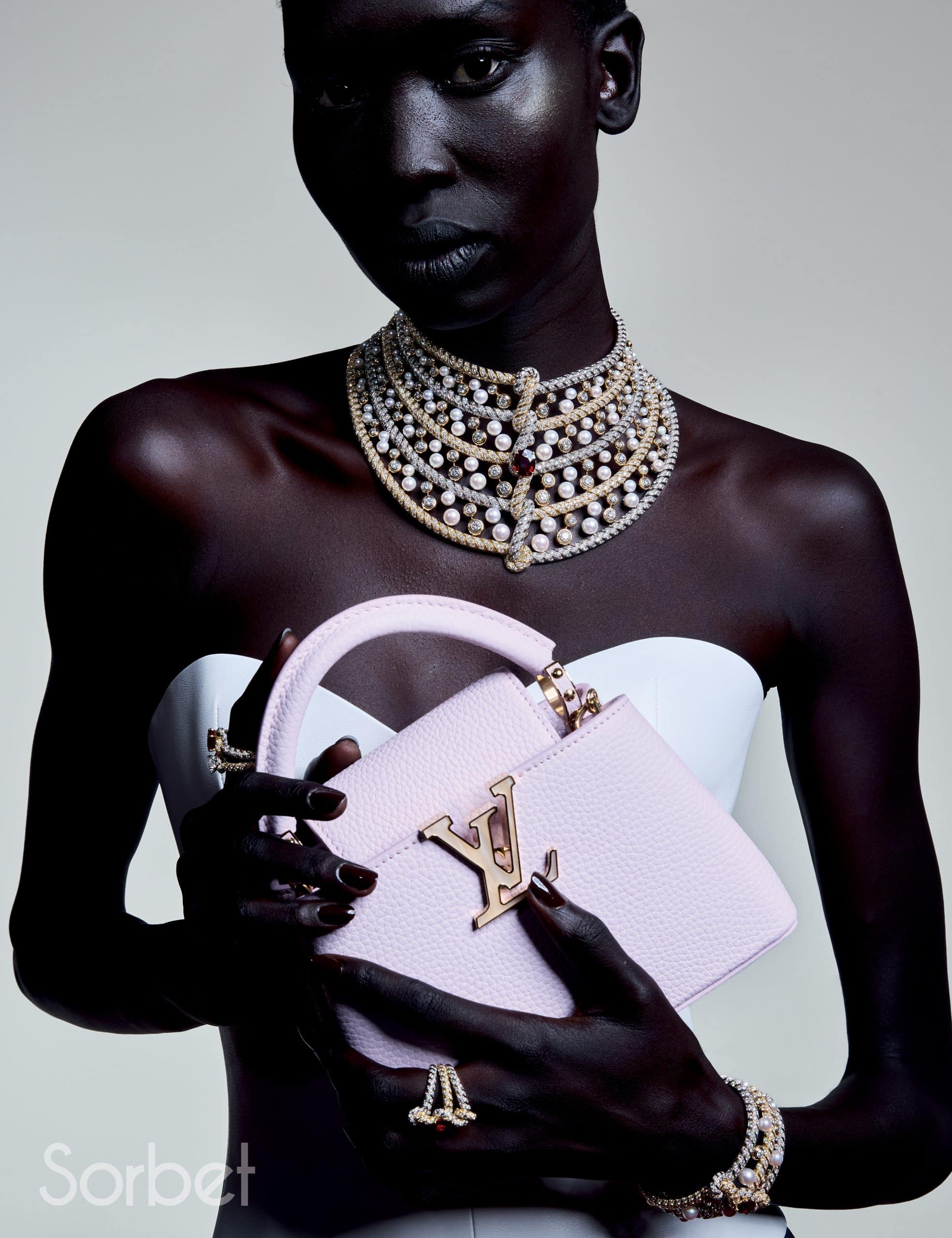 Connection necklace, bracelet, rings, in yellow and white gold with diamonds, ruby and pearls, Louis Vuitton Virtuosity Collection, LOUIS VUITTON HIGH JEWELRY; Sports bra and Mix-print Floral and Monogram cargo pants, leather bustier top and Capucines Chain BB Jasmin Rose, LOUIS VUITTON