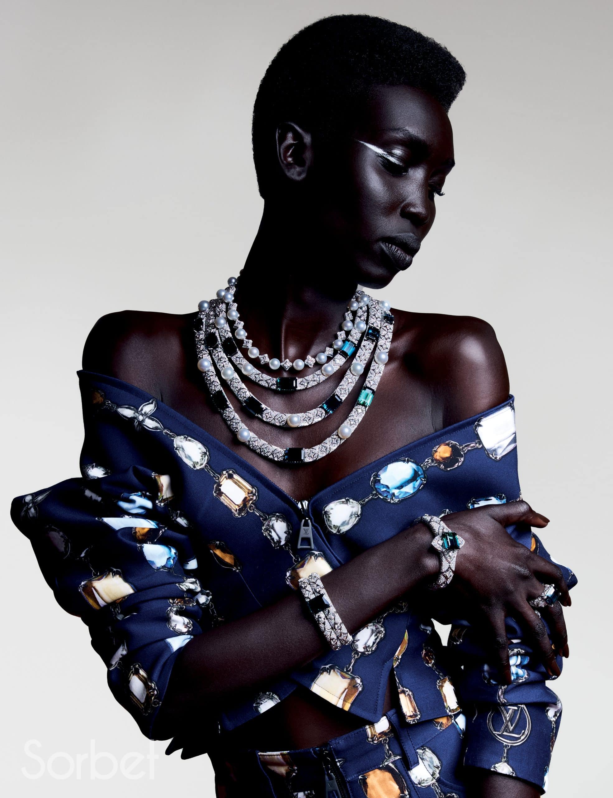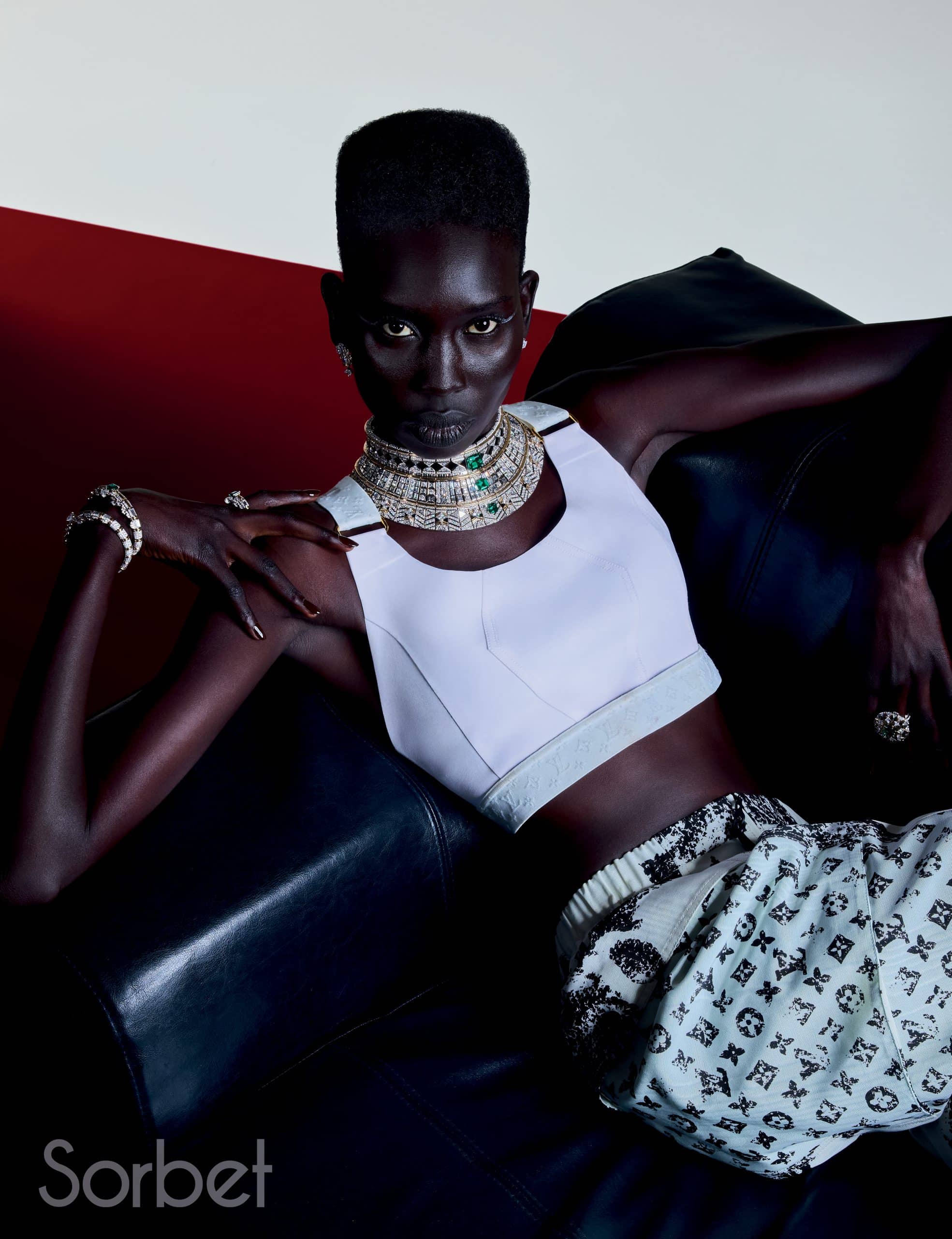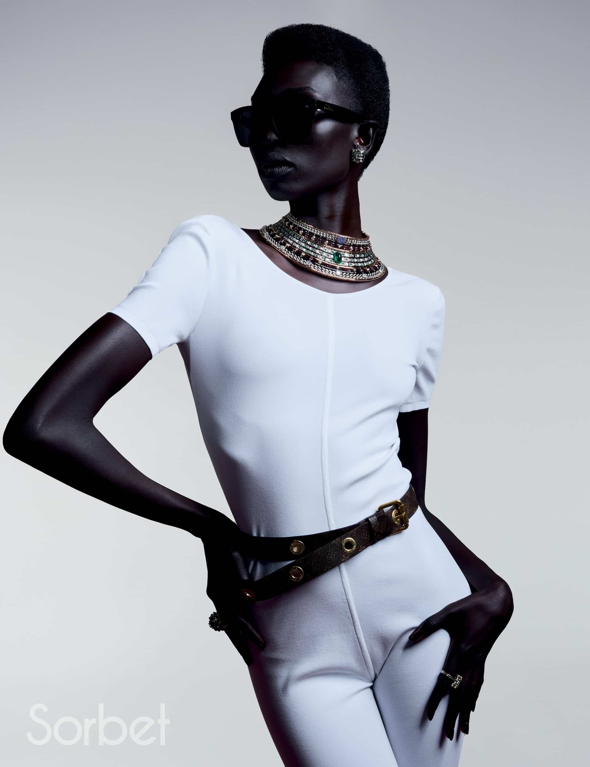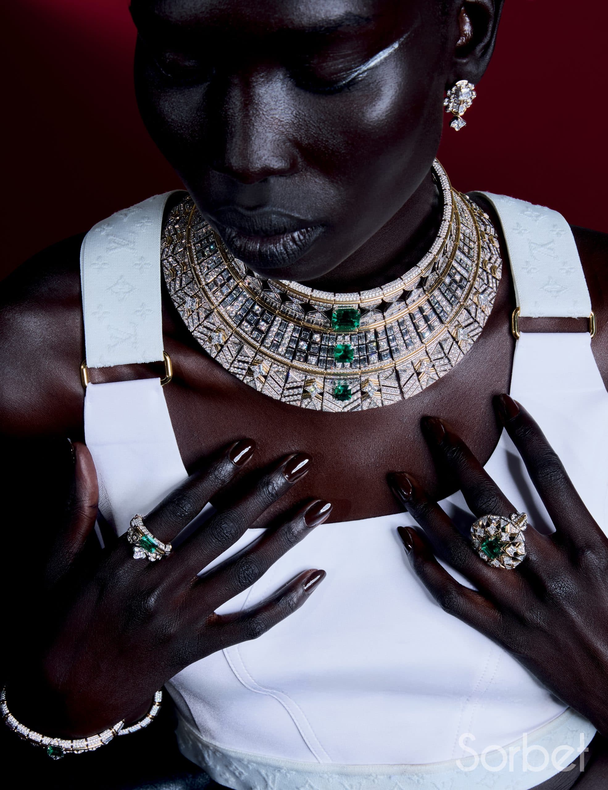Connection necklace, bracelet, rings, in yellow and white gold with diamonds, ruby and pearls, Louis Vuitton Virtuosity Collection, LOUIS VUITTON HIGH JEWELRY; Sports bra and Mix-print Floral and Monogram cargo pants, leather bustier top and Capucines Chain BB Jasmin Rose, LOUIS VUITTON
