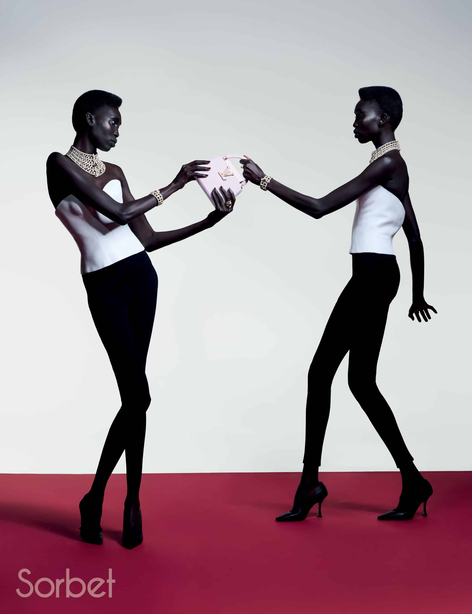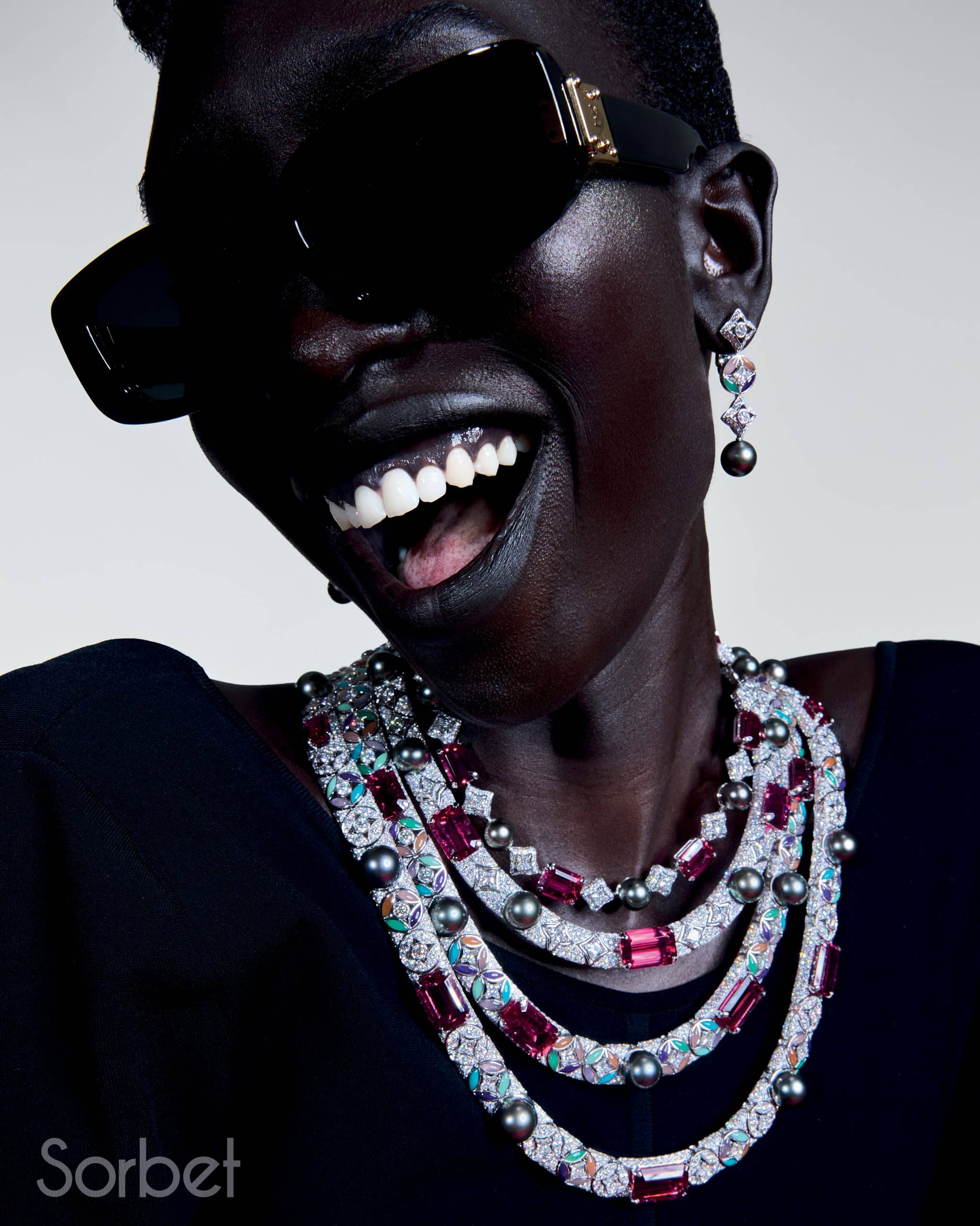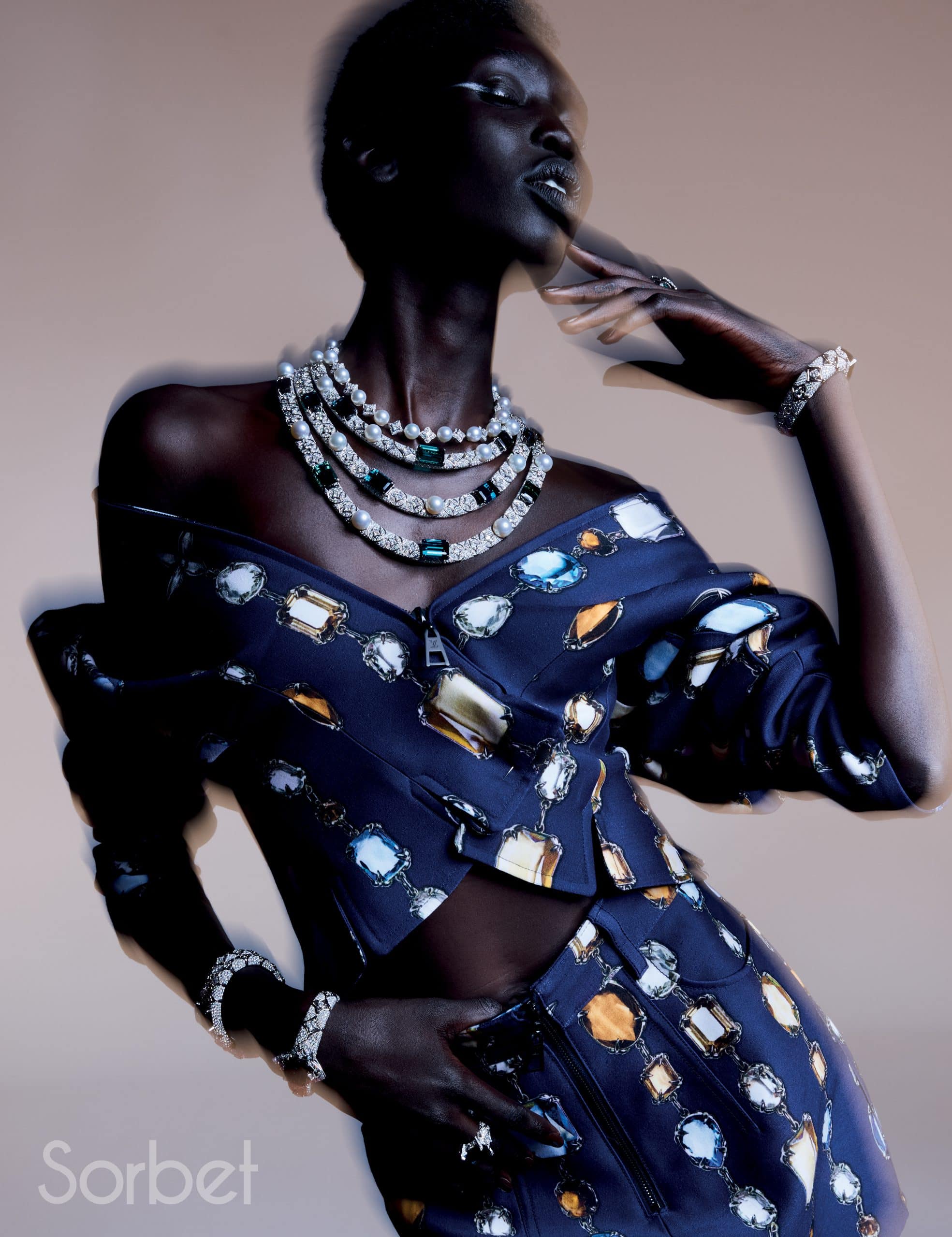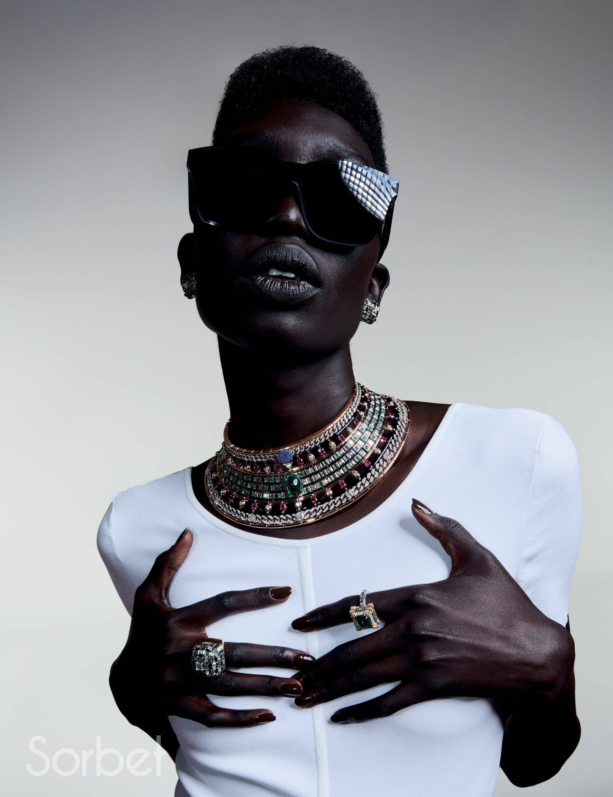 Connection necklace, bracelet, rings, in yellow and white gold with diamonds, ruby and pearls, Louis Vuitton Virtuosity Collection, LOUIS VUITTON HIGH JEWELRY; Sports bra and Mix-print Floral and Monogram cargo pants, leather bustier top and Capucines Chain BB Jasmin Rose, LOUIS VUITTON