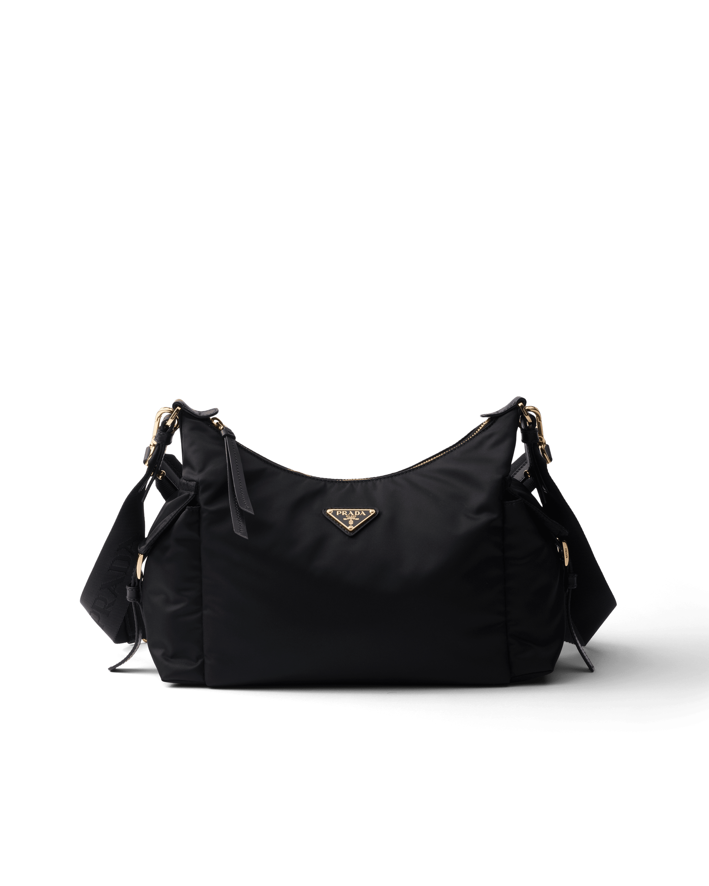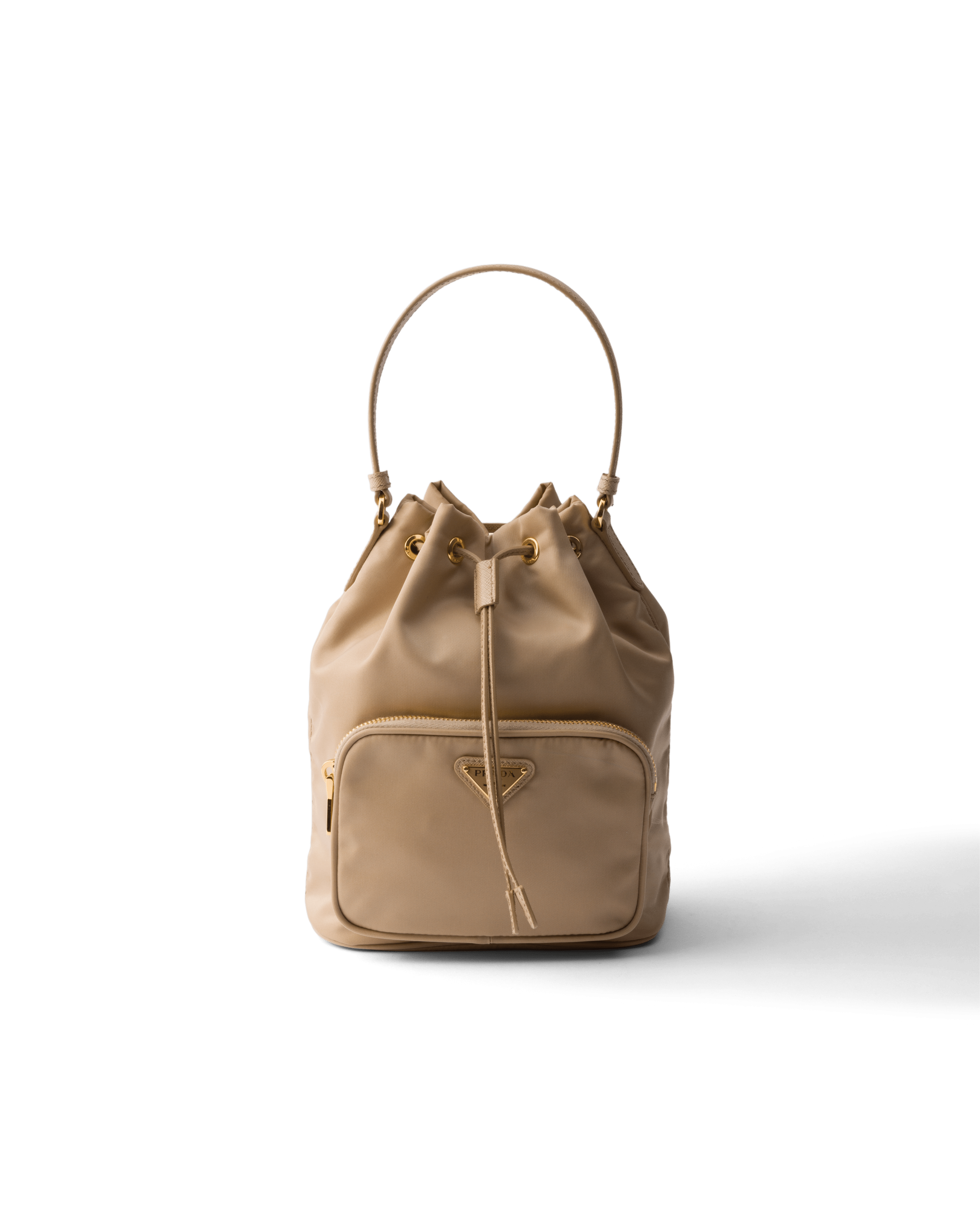 Proudly donned by Letitia and Benedict in the campaign, backpacks are a core element of Prada’s accessory line. Reimagined in this regenerated material, they combine functionality with an eco-conscious ethos.
