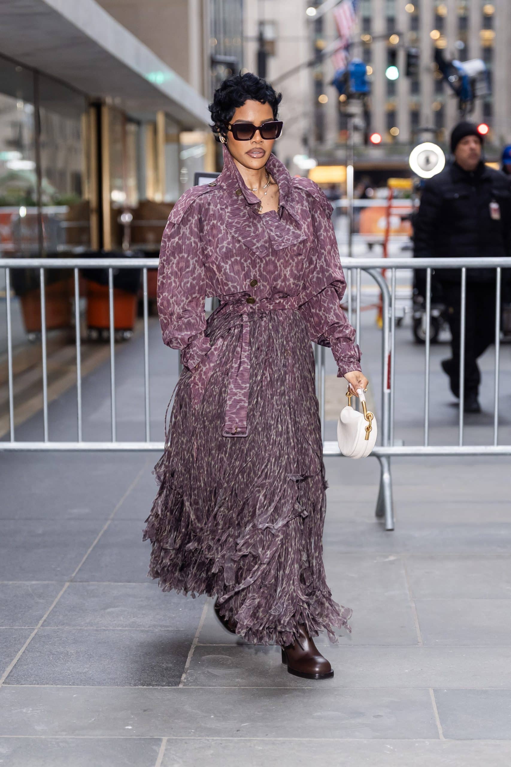 Redefining the Burberry trench is a plum baroque-print get-up, finished with a flirt of the fringe. Embodying Tey’s soulful, magnetic spirit, this Fitzrovia performs everything from vintage opulence to modern edge.
