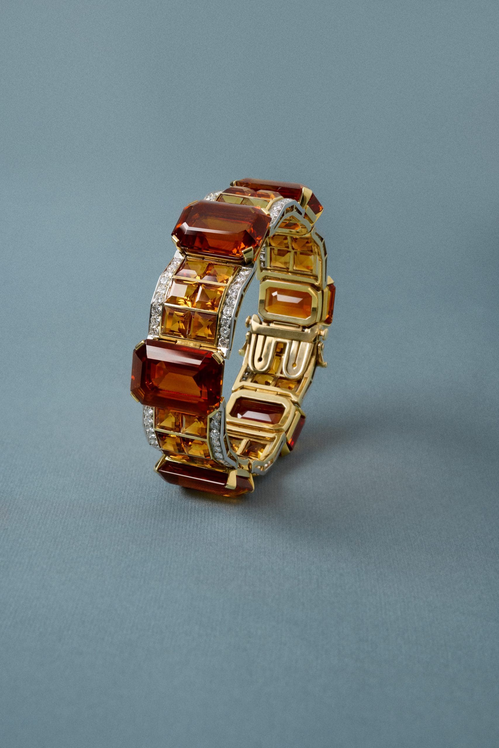 Supported by the Italian Embassy in Japan, the exhibition features nearly 350 chromatic masterpieces spanning jewelry from the Bvlgari Heritage Collection alongside private and newly released pieces. Highlights include a platinum bangle set with cabochon sapphire, rubies, and diamonds from 1954, a dramatic clash of red and blue; a citrine bracelet in gold and platinum with diamonds, circa 1940, never before displayed outside Italy; and a circa 1978 Serpenti evening bag in tri-color gold with a silk cord and diamonds, blending yellow, rose, and a rare blue-green hue known as acqua di mare into a single show-stopping piece.