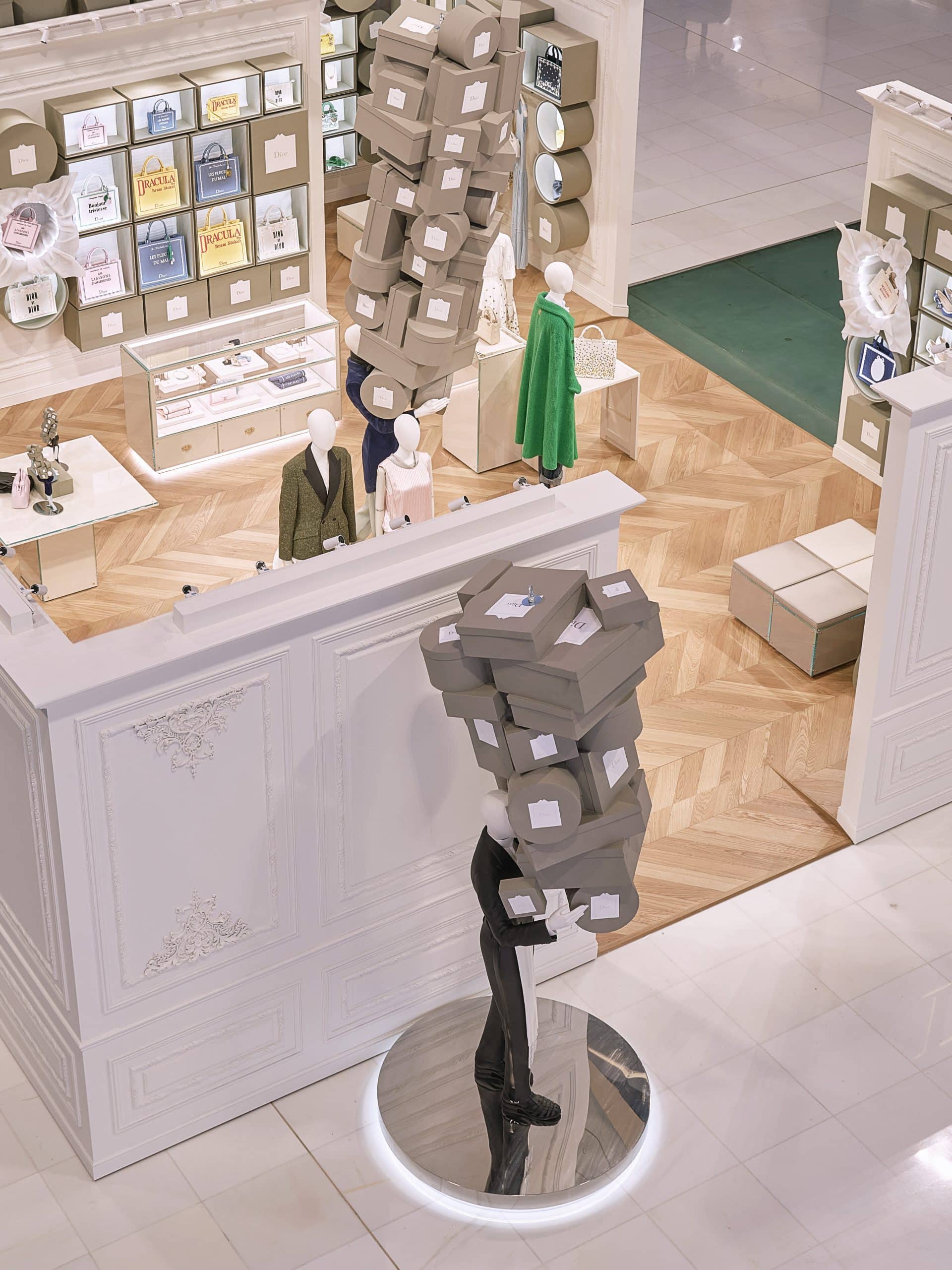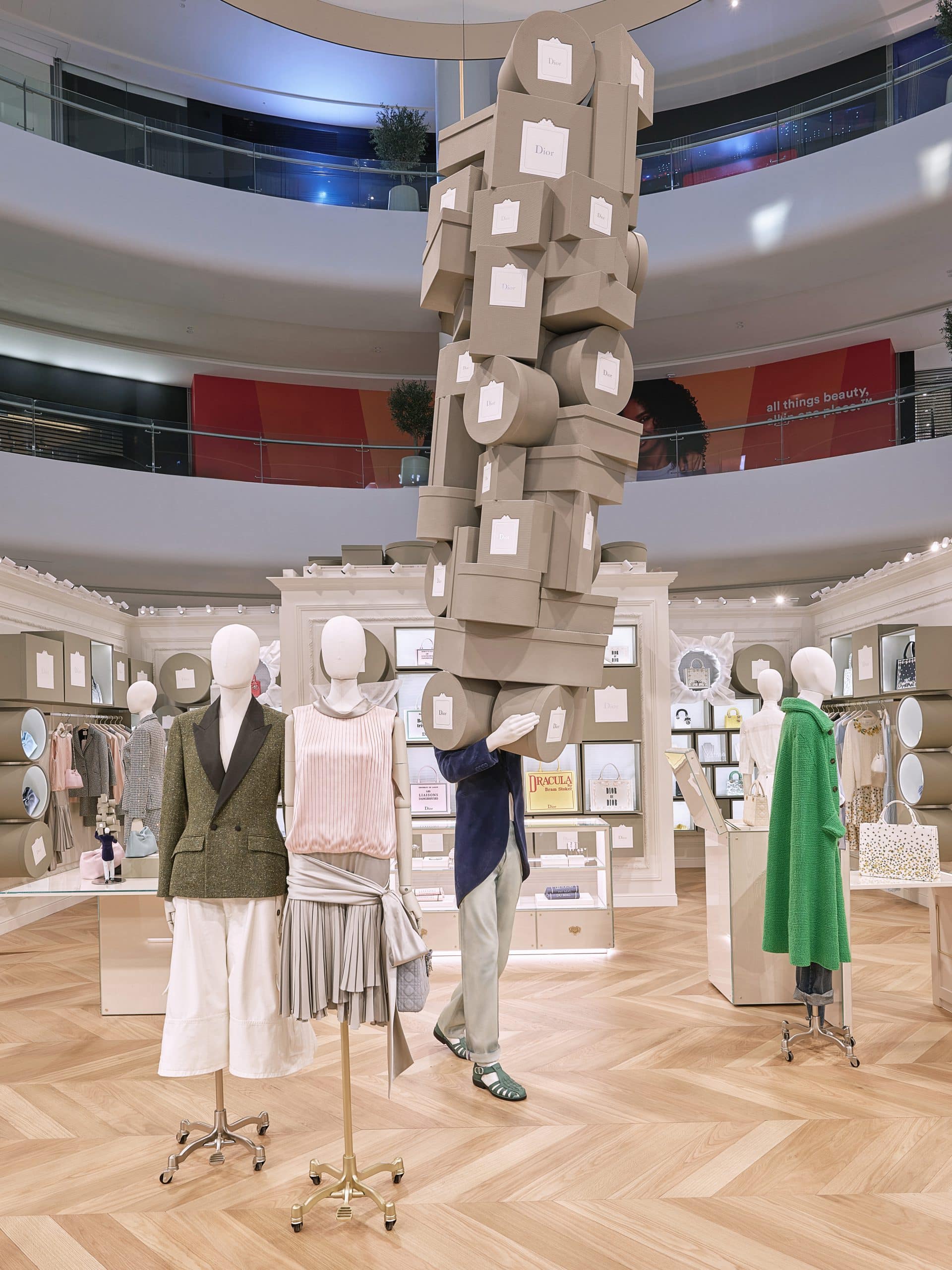 Cheeky bellboys weave through the installation carrying towers of boxes, adding movement and theatricality. The effect is light, surreal, and oddly chic, like shopping inside a fashion illustration.