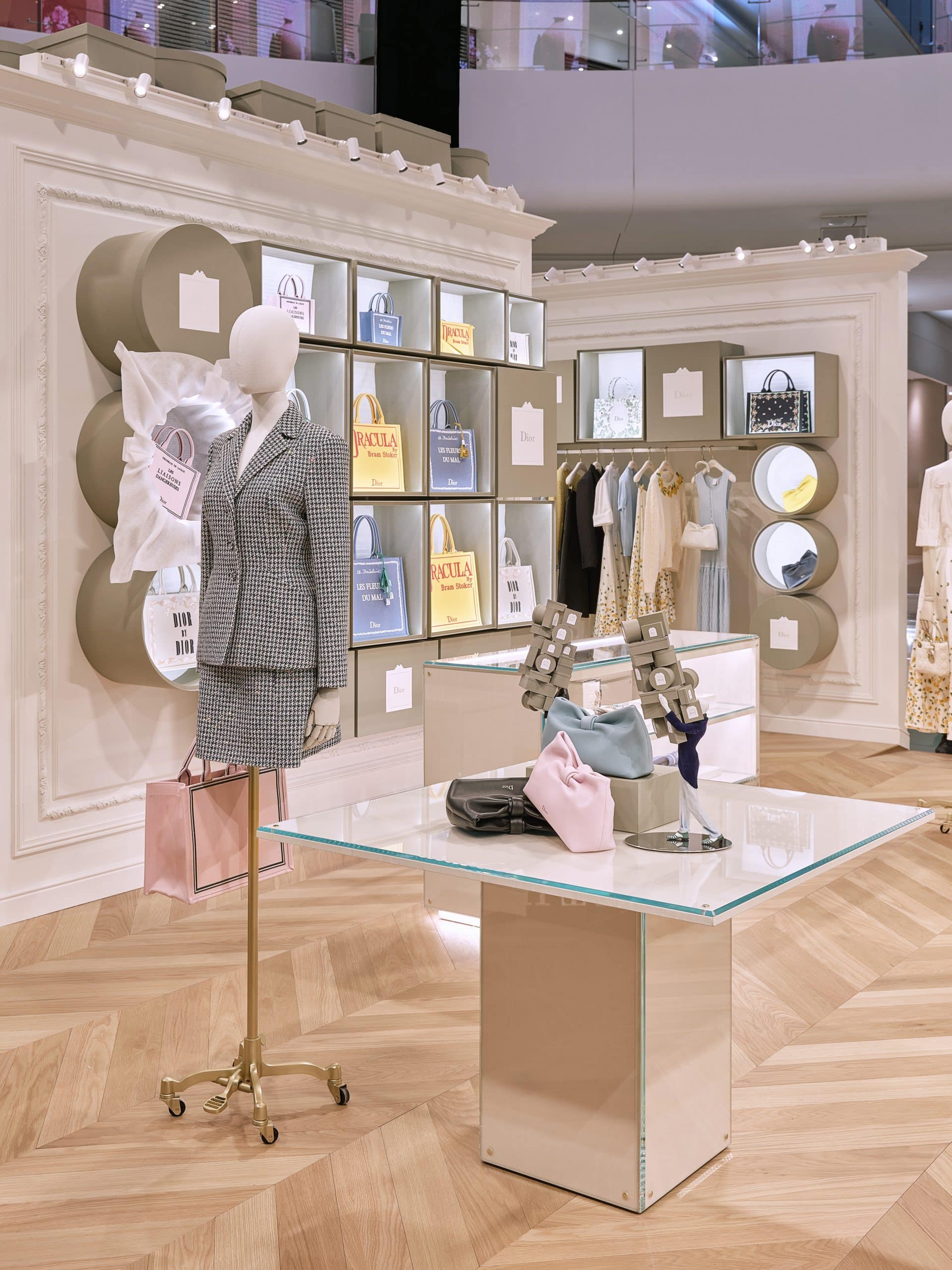 Rather than a conventional boutique layout, Dior goes for immersion. The space is built around playful tributes to House heritage, including oversized reinterpretations of the iconic boxes from Dior’s first boutique, Colifichets. Inspired by the signature gray of 30 Montaigne and archival storage cases, the boxes are stacked high, scattered, and intentionally off-kilter, turning Dior heritage into a playful set design.