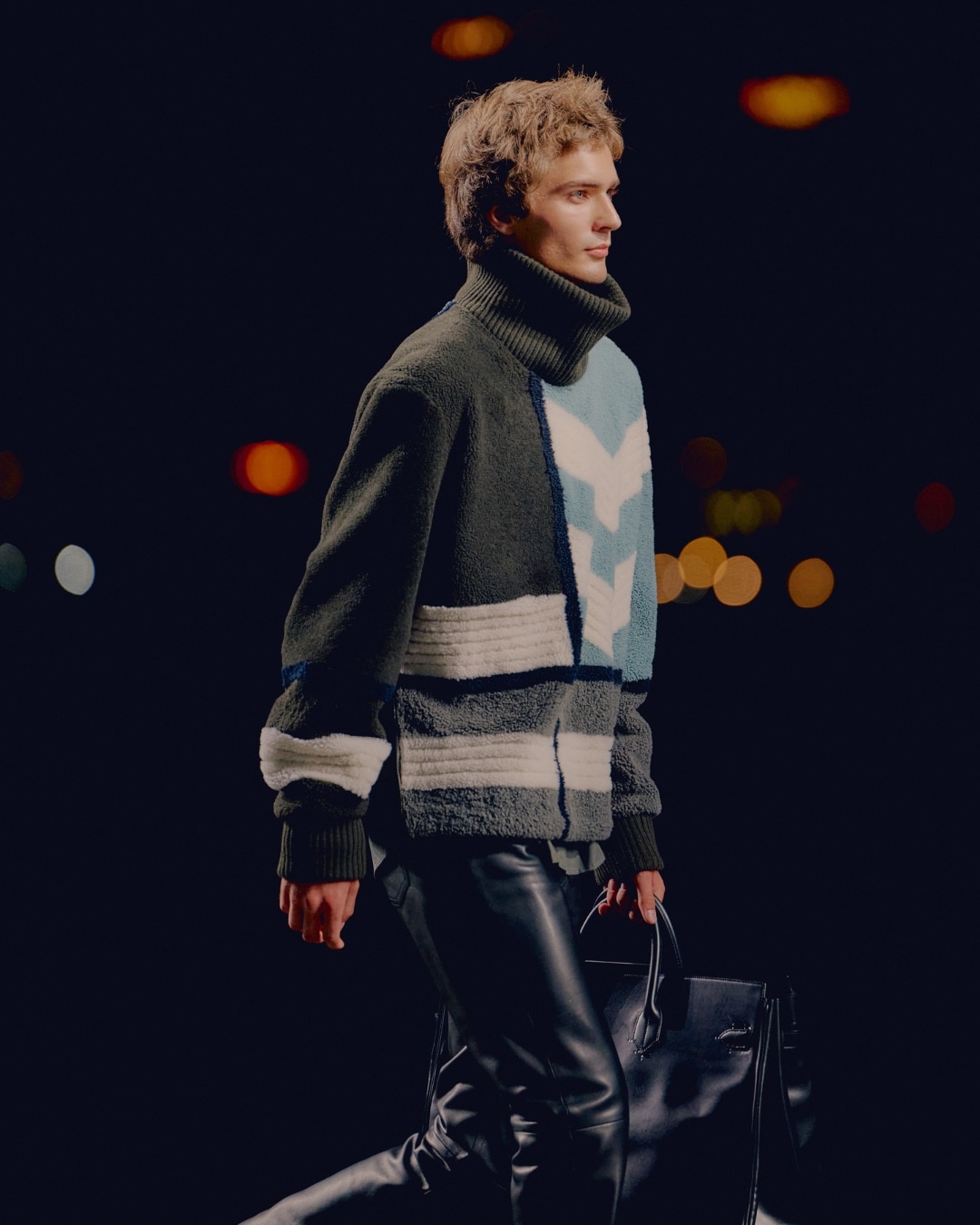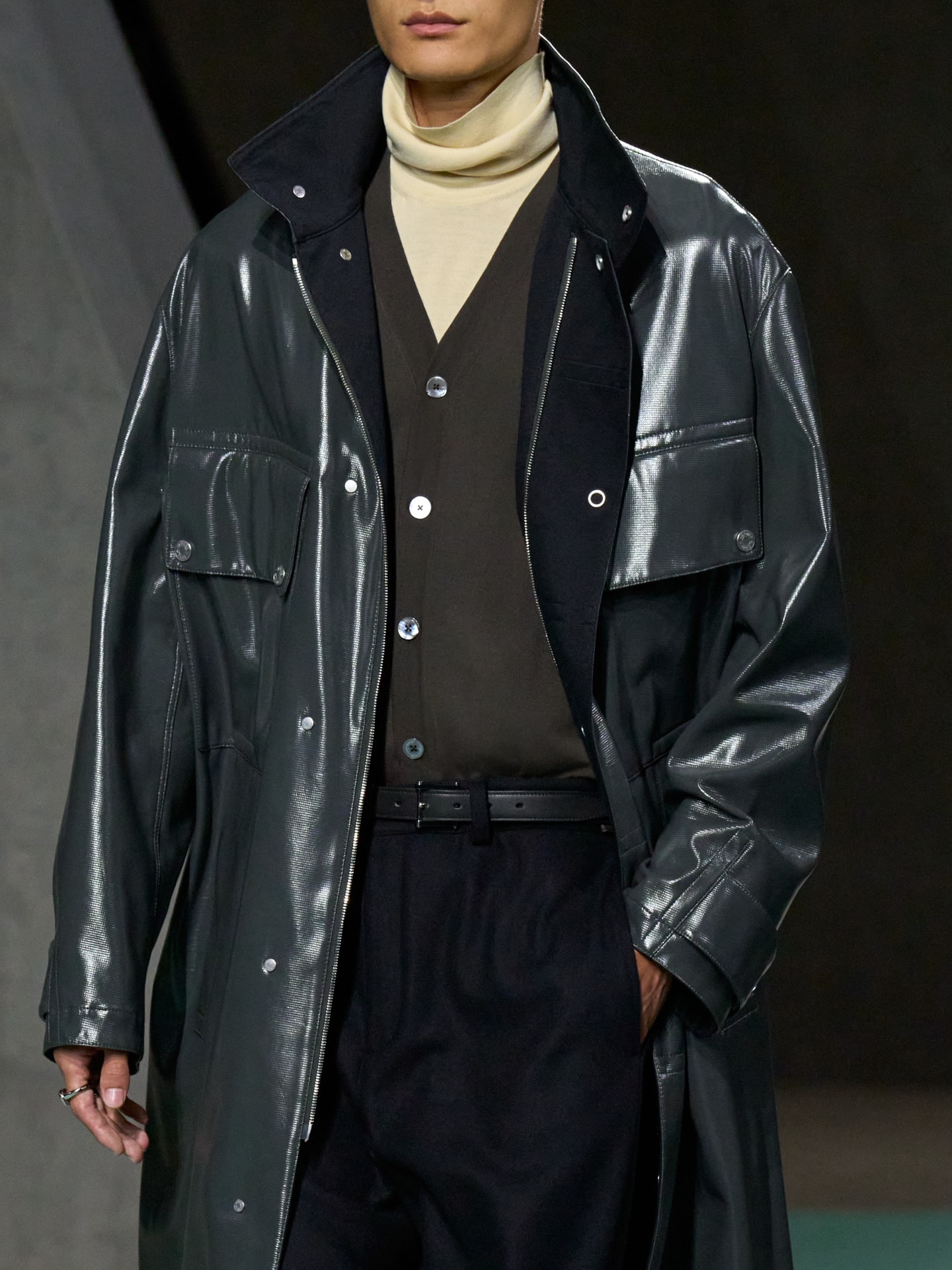 Velvet, rubberised calfskin, wool, shearling, satin… Fabrics were tactile, a modern embrace in architectural and undeniably masculine form. The overall effect was dynamic, one of gloriously sophisticated yet youthful dressing.
