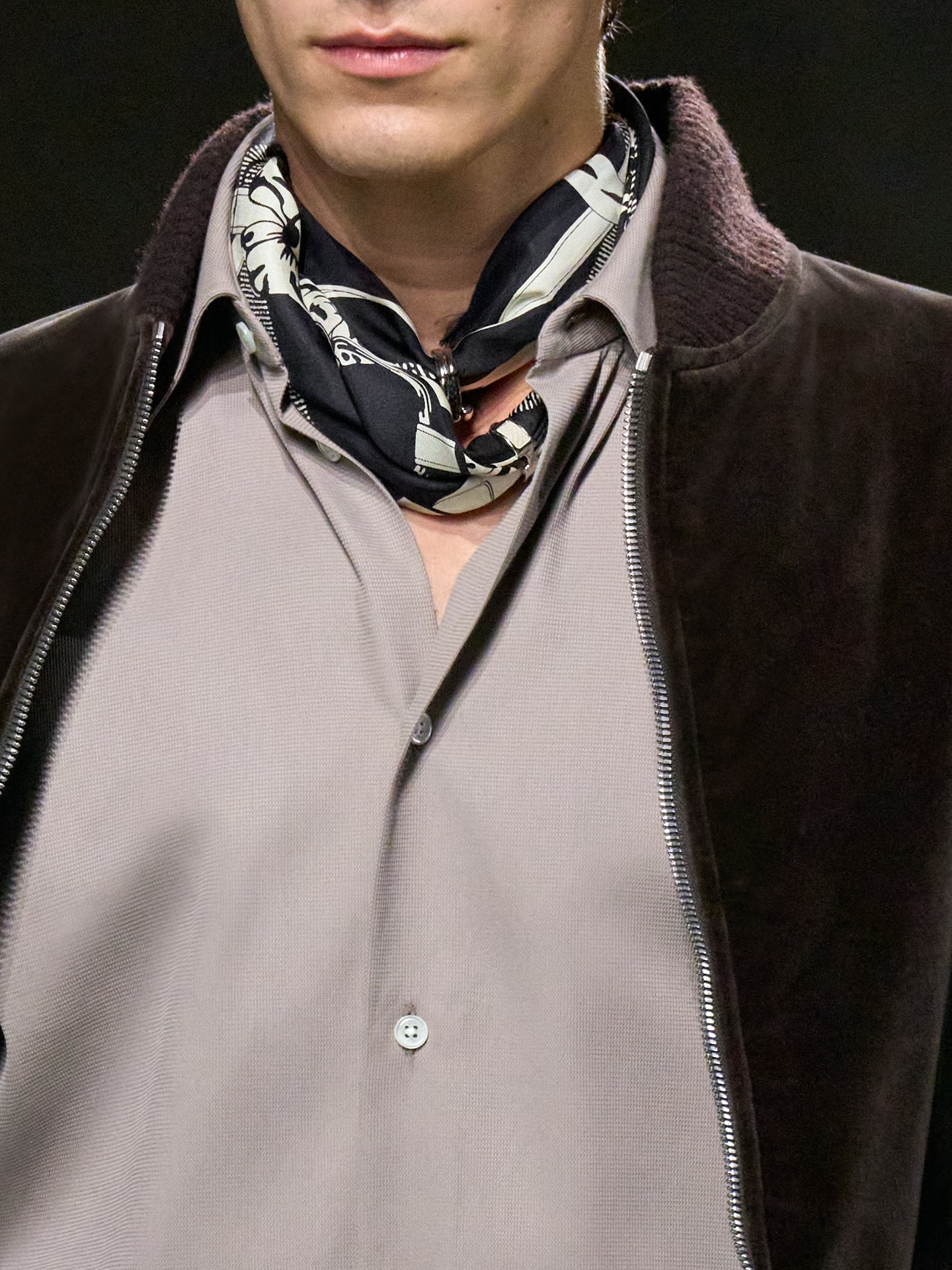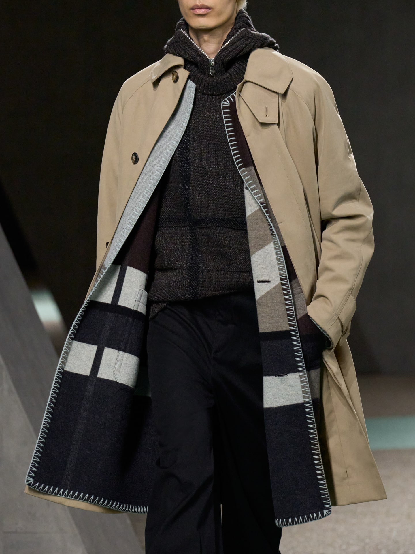 The neckline was a focus; the eye drawn by a silk scarf, funnel neck, turtleneck, a top button closed, a softly zippered gathering. The throat, as anyone who knows their chakras will tell you is the Vishuddha, the fifth chakra, associated with communication, truth, and self-expression. As an allegory, it feels right that Hermes should wrap this area in delicate swathes of fabric, a suggestion if it were needed, that talking softly, gently, and with intent to understand is key to moving forward.