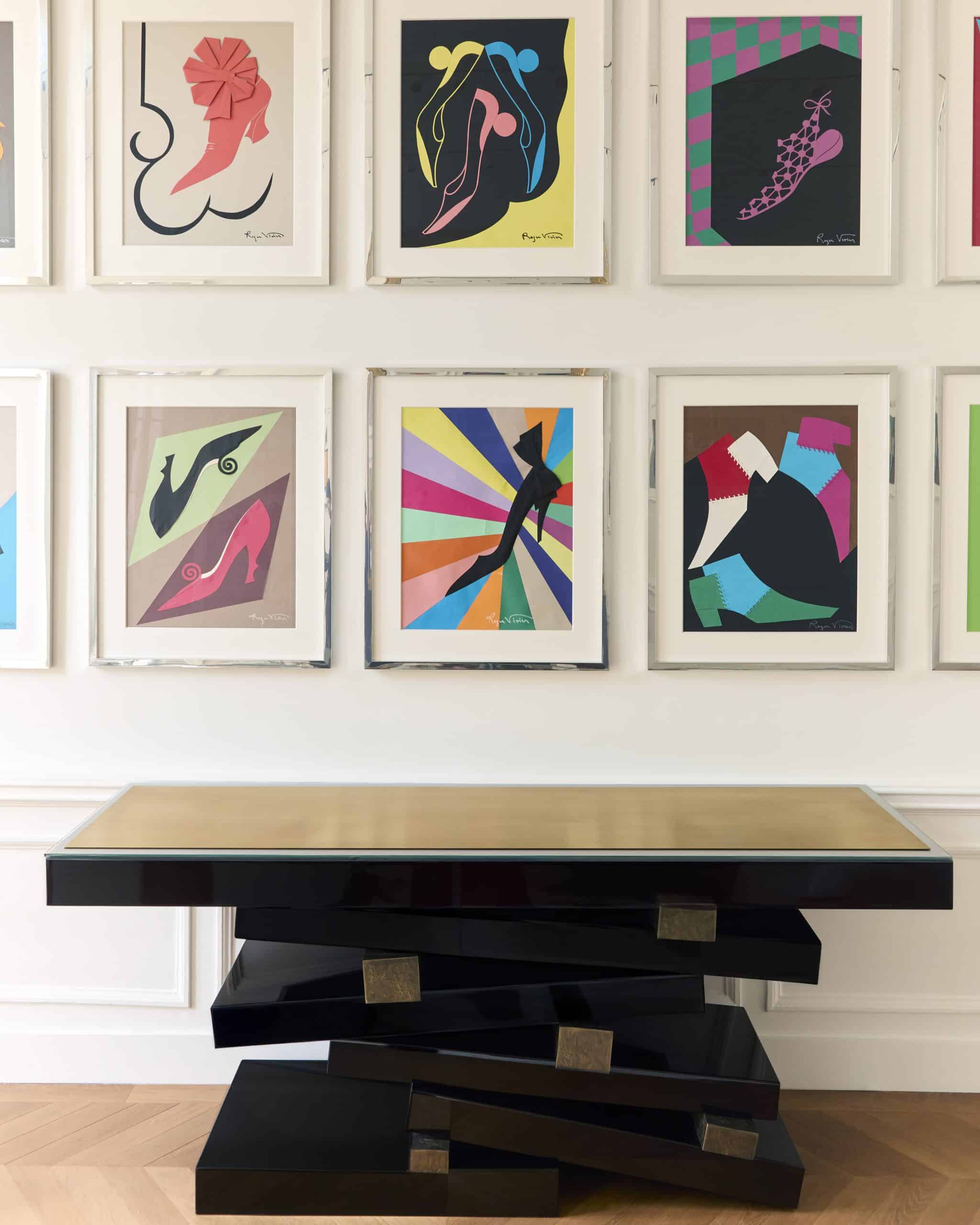 Felloni’s office reflects his eclectic Parisian sensibility. Vivid pinks and greens frame a Chinese Art Deco rug, antique armchairs, and a sculptural desk by Duccio Maria Gambi, while shelves lined with archival shoe boxes nod to his early explorations. Personal touches – a dog portrait, vintage cups, books on art and gardens – turn the studio into a living atelier where heritage sparks new visions for the vivacious designer.