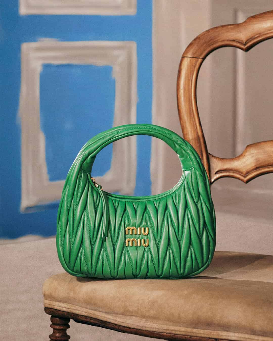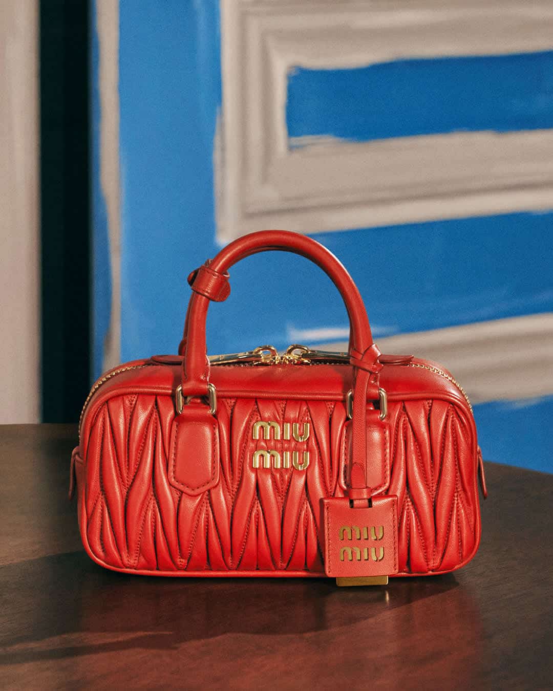 But the real scene-stealers are the Arcadie and Wander bags – consider our attention diverted. They were, after all, the two most important possessions Gigi thought to bring with. Both bags move in, shaped by Miu Miu’s signature matelassé leather, plush and pillowy in all the right ways. They pop against the subdued backdrop in shades that range from punchy primaries to more understated tones. A little clash here, a lot of charm there, the Arcadie and Wander are already looking at home next to G.
