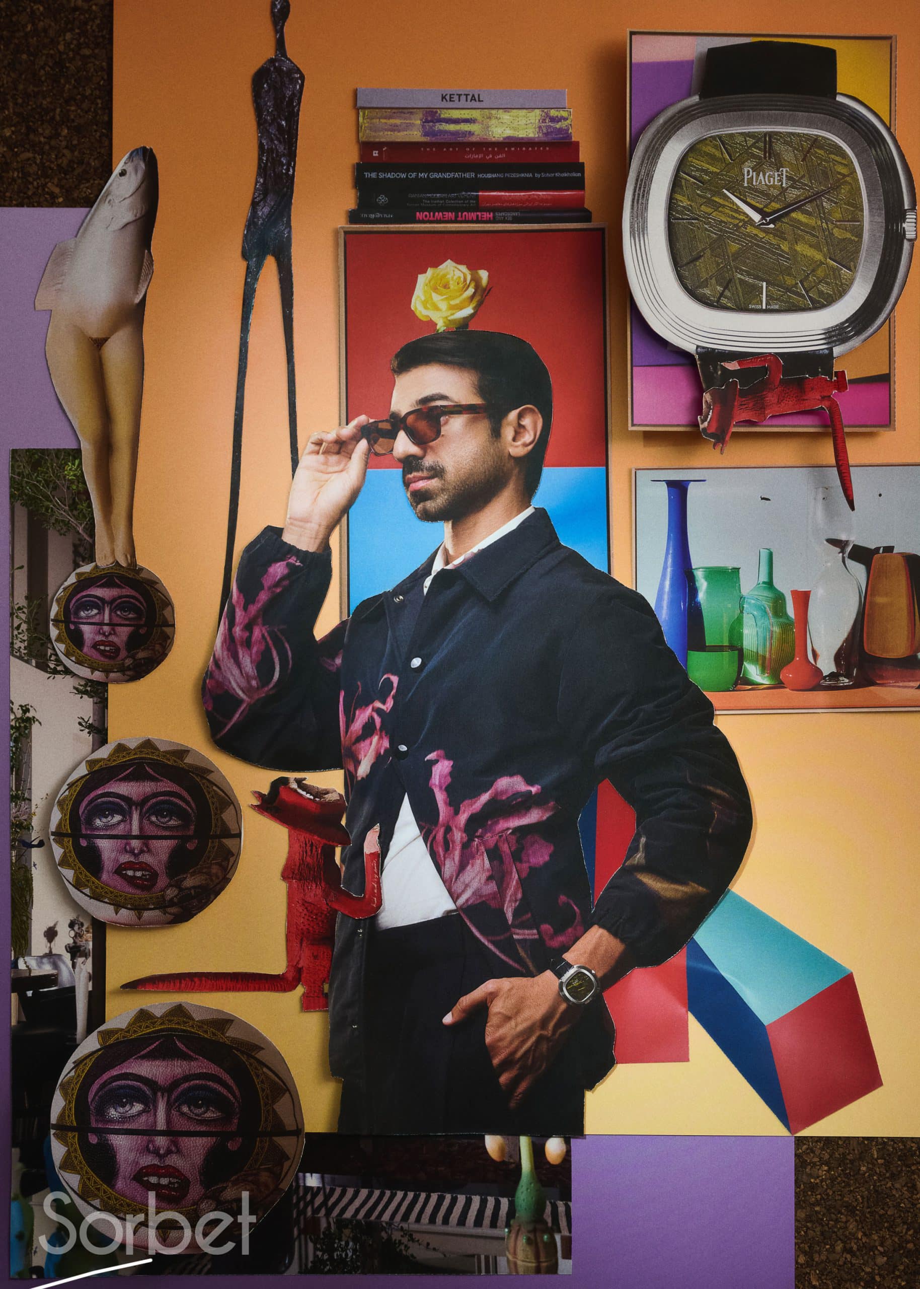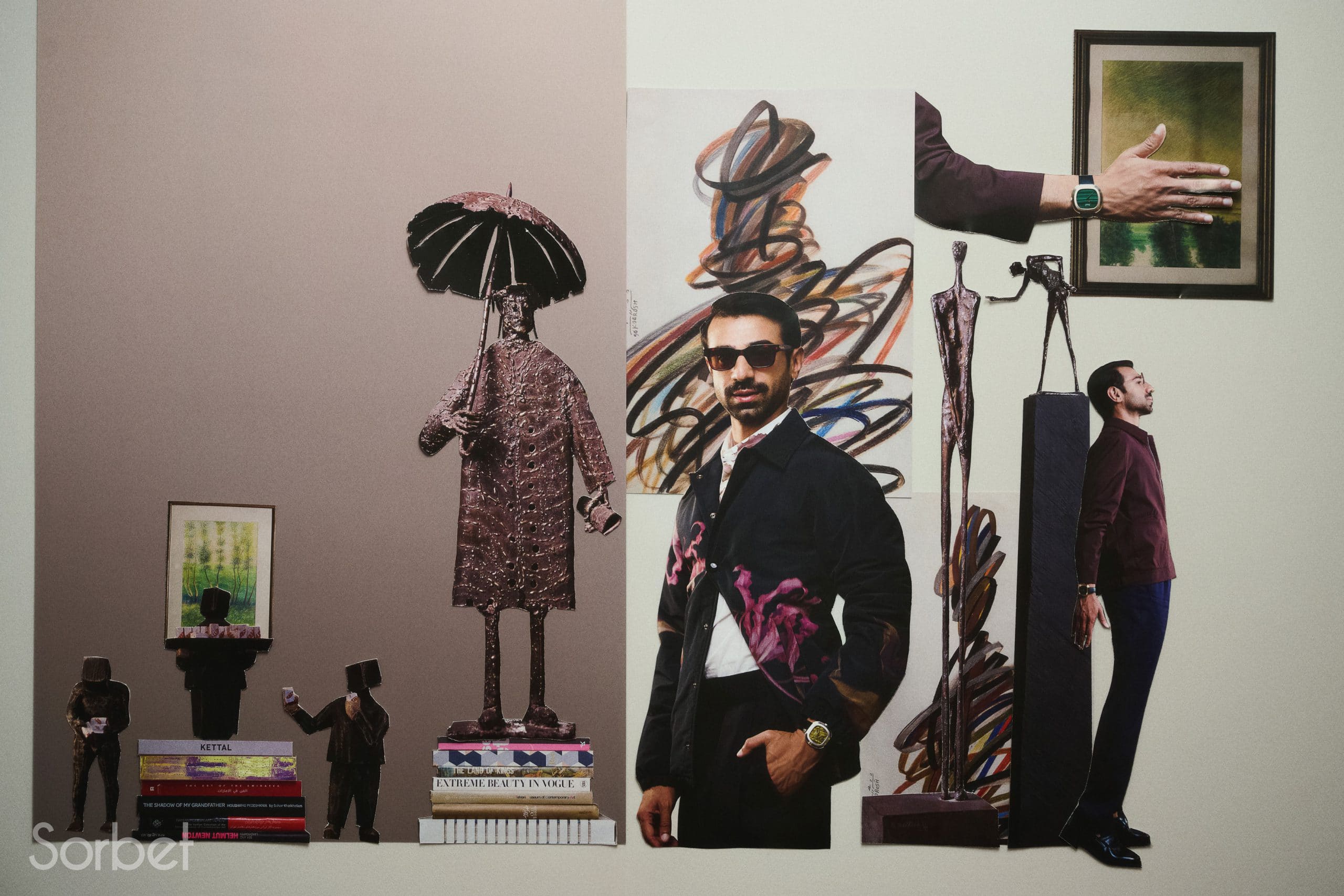 Surrealist collage of filmmaker Abdulla Alkaabi in stripped blue and grey Loewe jacket, with Piaget Warhol watches and art works in the background