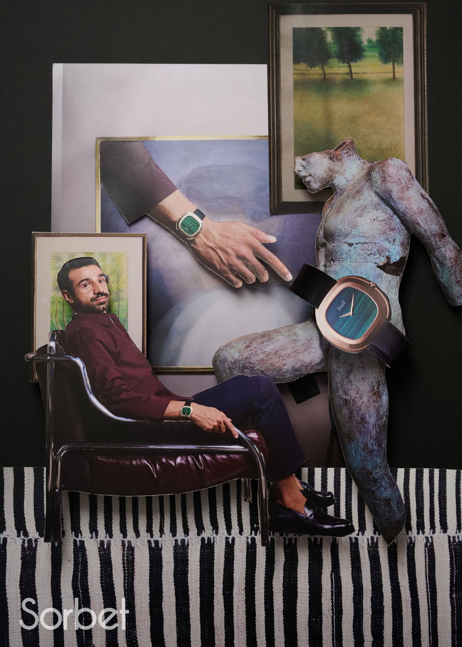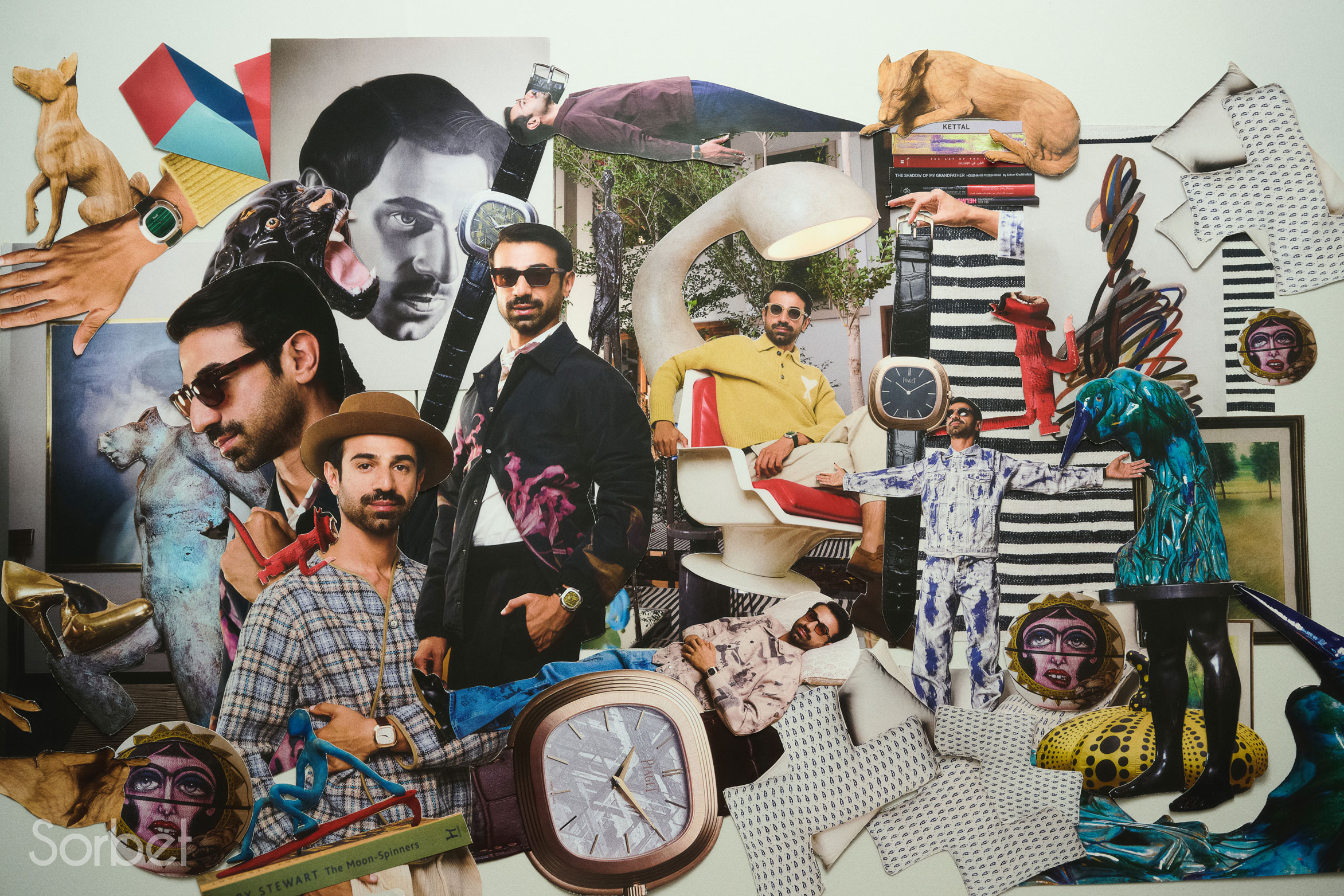 Surrealist collage of filmmaker Abdulla Alkaabi coming out of a frame in stripped blue and grey Loewe jacket, with Piaget Warhol watches and dog statues all around