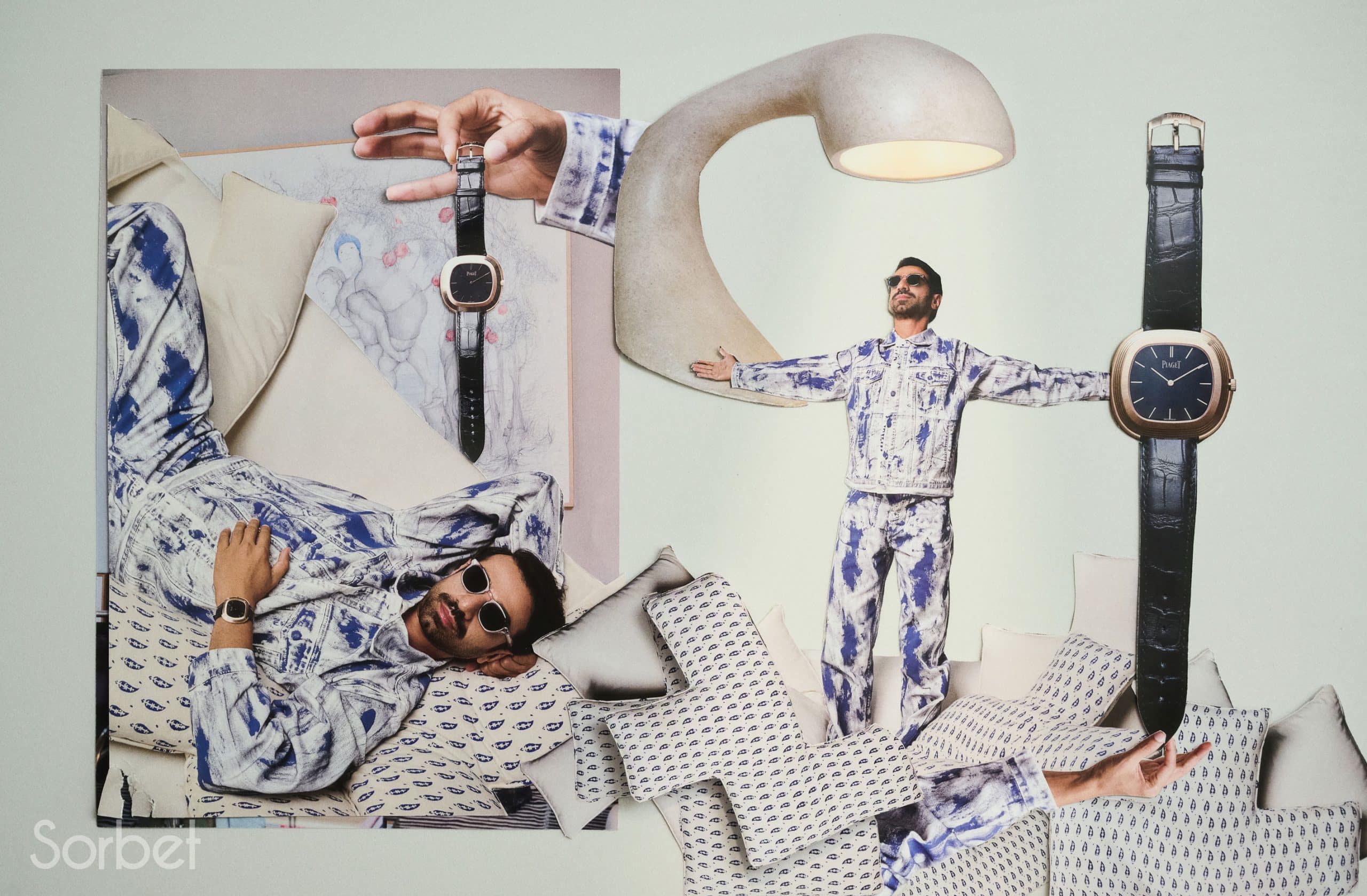 Surrealist collage of filmmaker Abdulla Alkaabi laying upside down wearing blue denim jeans and white graffiti jacket, with Piaget Warhol watches