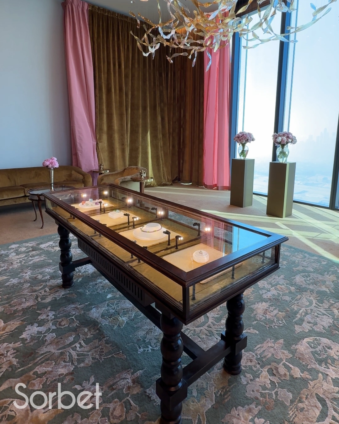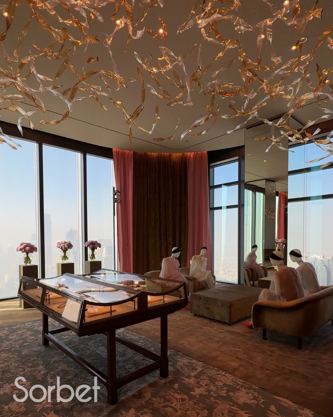 All of this is crystallized in Dubai, where the collection’s physical presentation felt like stepping into Prada’s subconscious. At the One&Only Za’abeel, two lacquered black wooden doors opened into a space where wooden and glass vitrines glowed flashes of purple, pink, and blue visible even from afar, as it is housing the Couleur Vivante collection. A turn toward the windows revealed the crystalline skyline of Dubai; turn back and the room softened into an intimate 1920s-inspired salon wrapped in champagne velvet. Prada mannequins sat in vivid shades, poised as silent witnesses to the chromatic world unfolding. And in the most intimate detail of all, the vitrines were Miuccia Prada’s own, brought specifically for the presentation, a gesture that made the space feel not staged but intimately curated.
