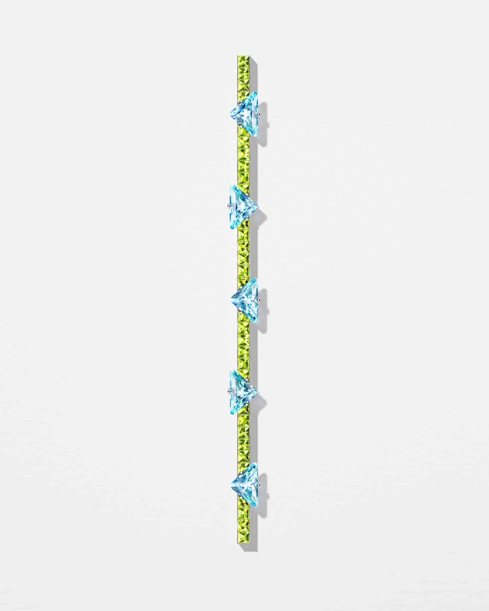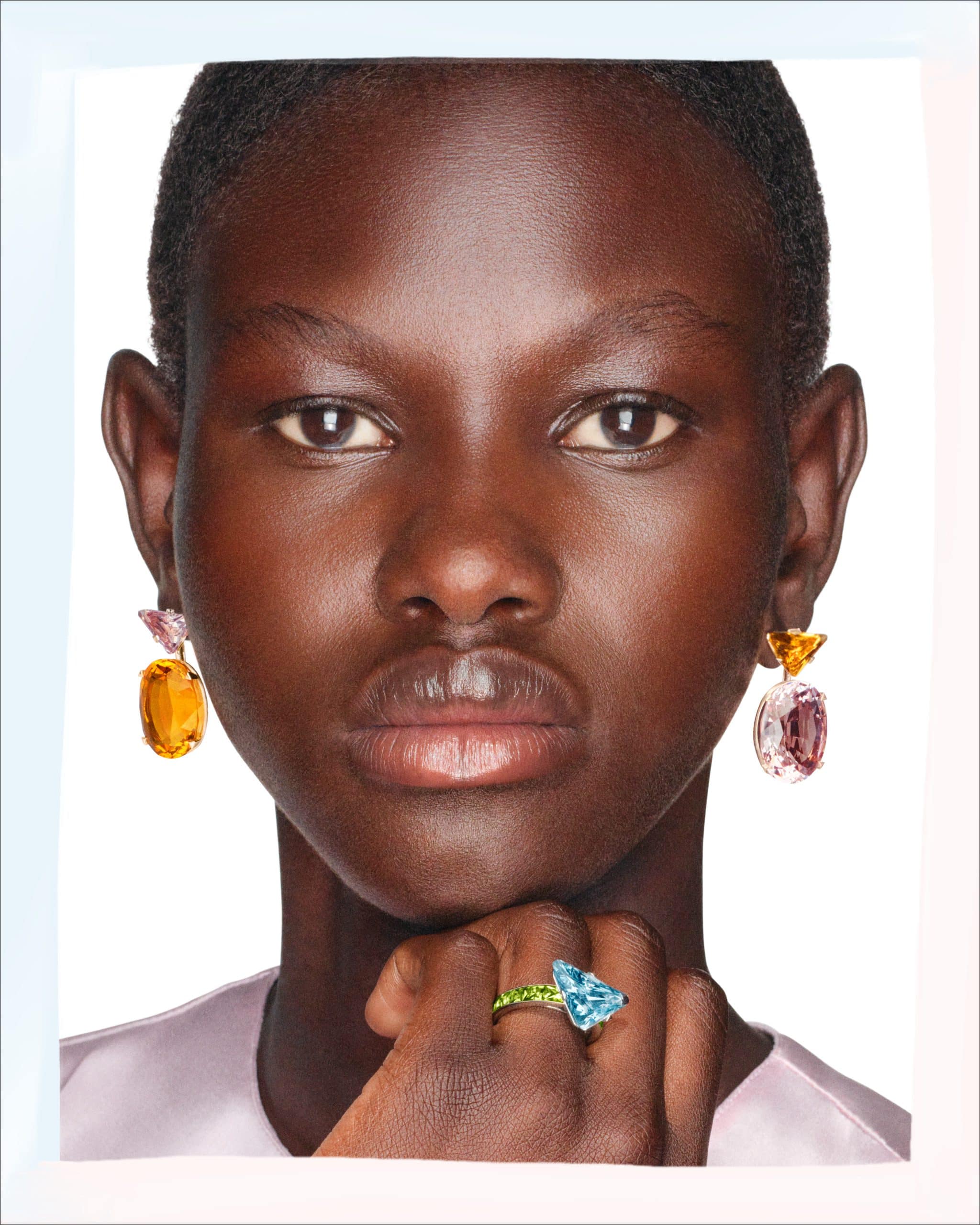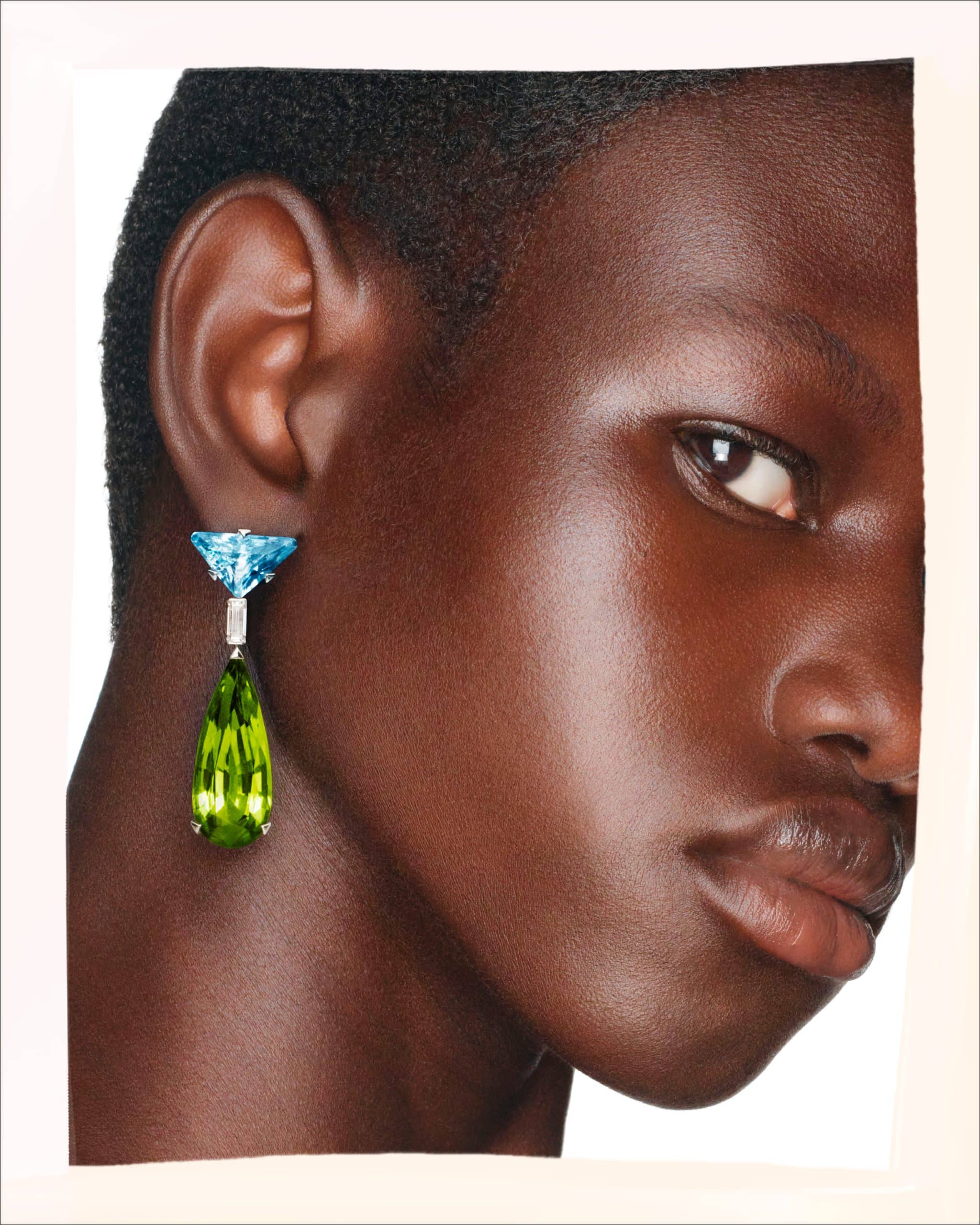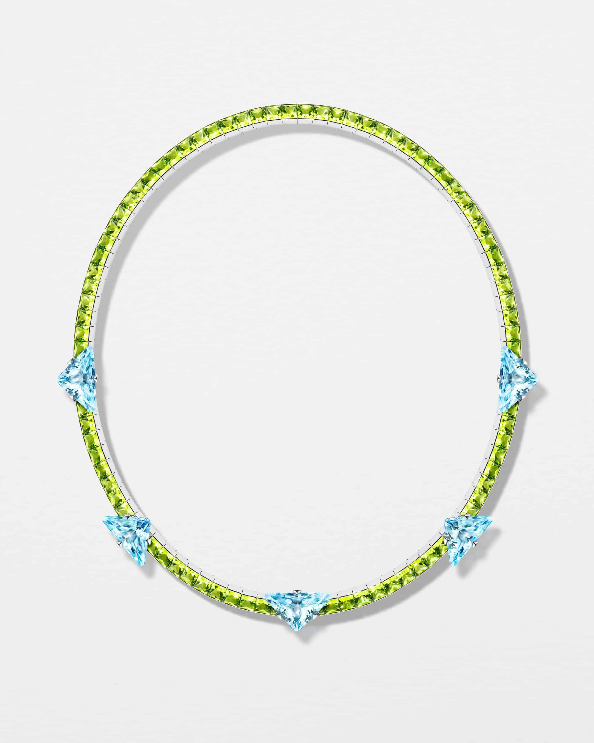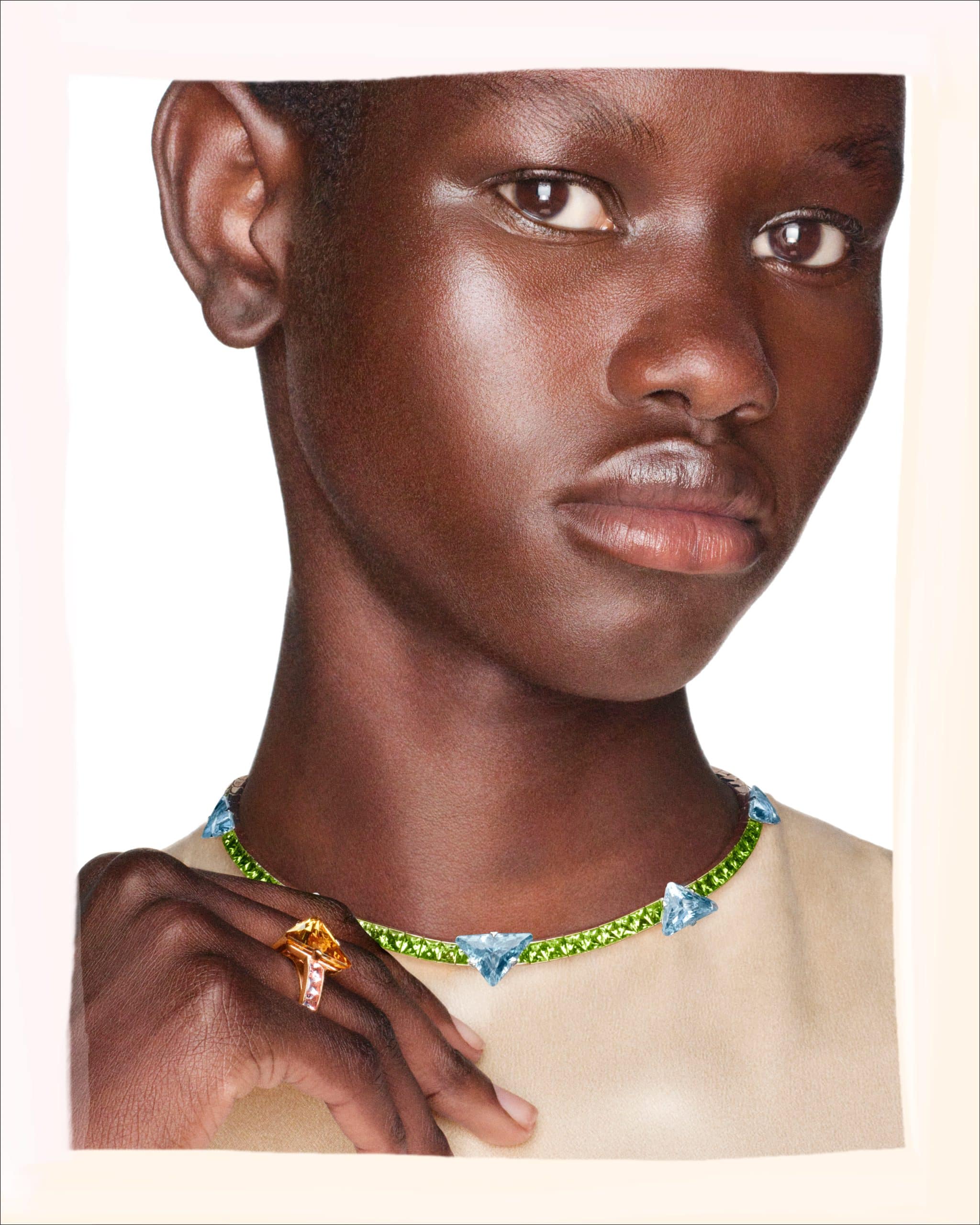 The craftsmanship strengthens that proposition. Taking the necklaces and bracelets as an example, what first appears to be a classic tennis silhouette shifts under closer study, its peridot links falling into a disciplined cadence and the suiffés cut creating a glide that feels almost liquid. These structural choices are not decorative; they allow the stones to shine bright in their most authentic color. This precision is also particularly evident in the Prada cut. As Jewelry Director Timothy Iwata explains, traditional settings hide pigment loss at a stone’s corners, but that would contradict the collection’s devotion to color in it purest form. Instead, clasps are placed at the sides, preserving the full chromatic face of the triangle. It is a technical adjustment, but also a conceptual statement.