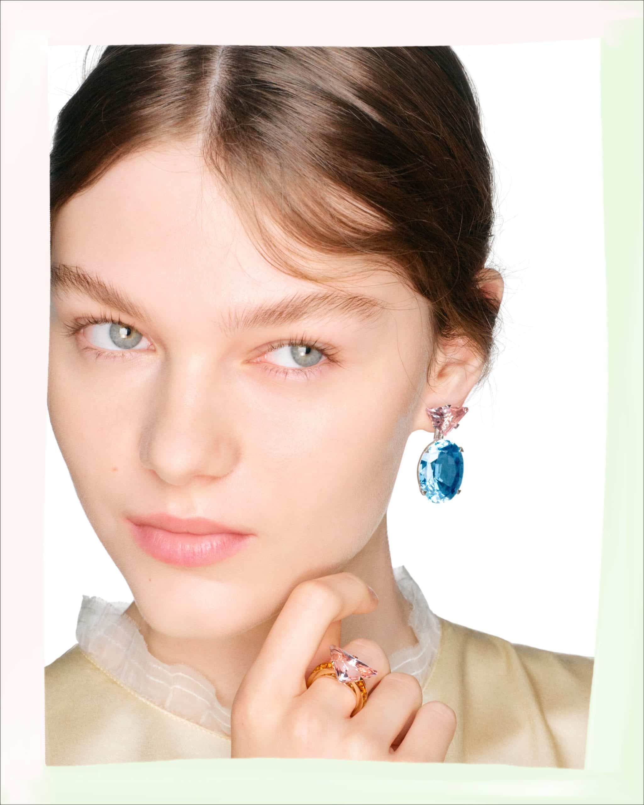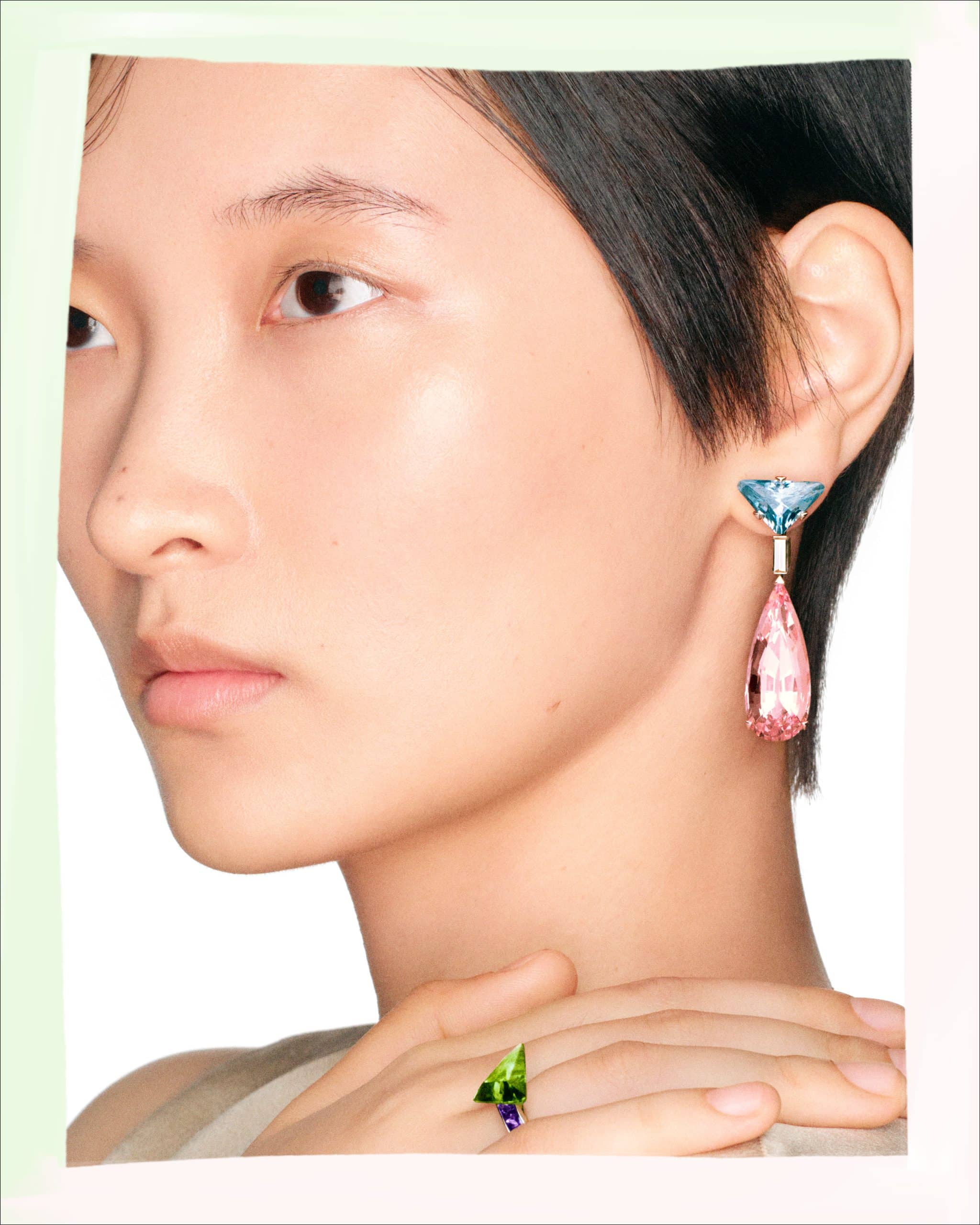 The philosophy of the collection becomes clear the moment you see the pieces up close. A pair of peridot earrings shaped in the iconic Prada triangle sets the tone immediately. The vivid green brightens the sharp lines of the form and makes it clear that color leads the design rather than simply decorating it. The necklaces and bracelets follow the same spirit. Their pastel pairing and gentle contrasts place color at the forefront and give each piece a presence while allowing each hue the room to make its own statement. Every stone is chosen for the quality of its color and the mood it brings, which reinforces the idea at the heart of Couleur Vivante: color is an integral part of the design.
