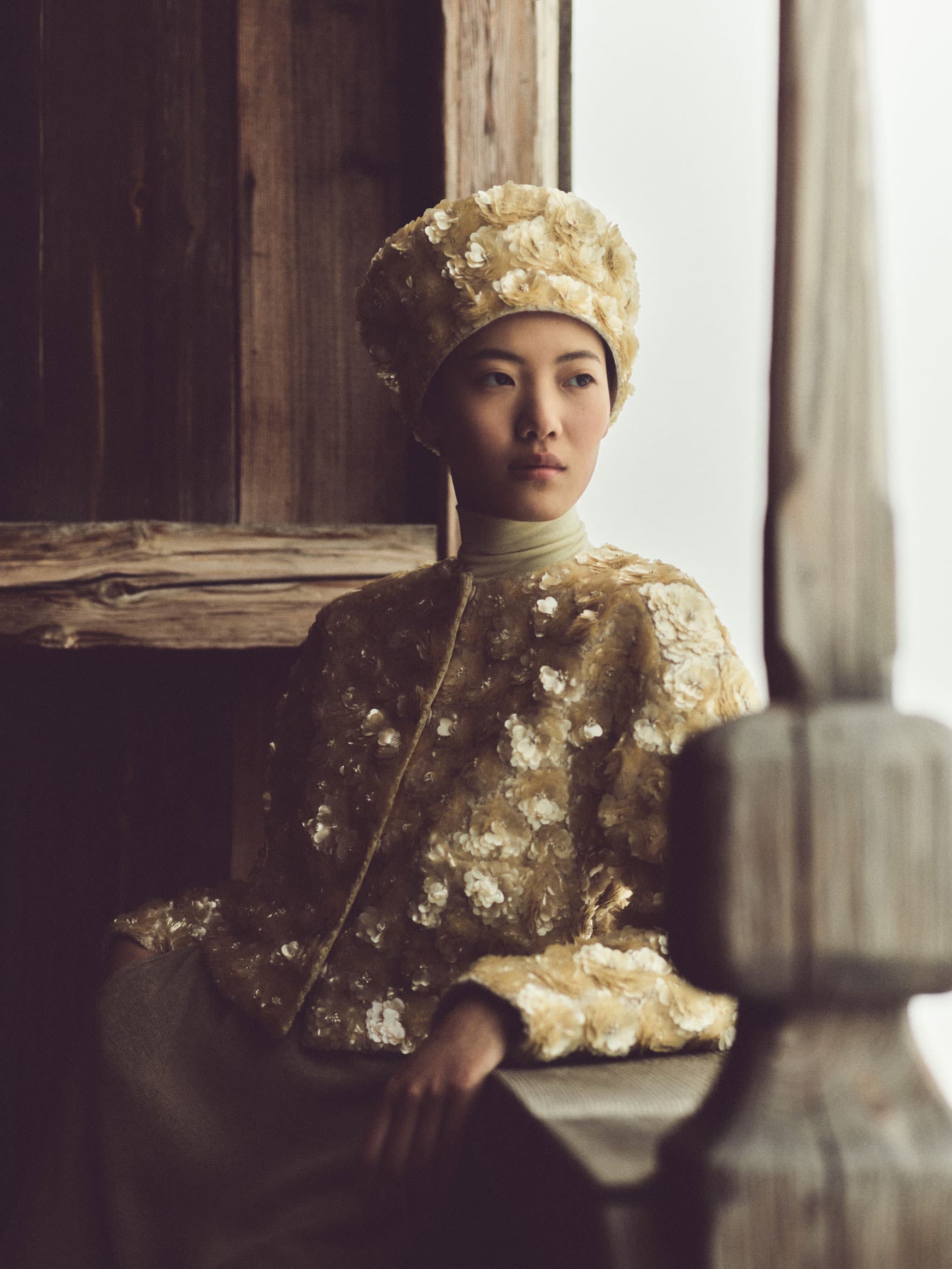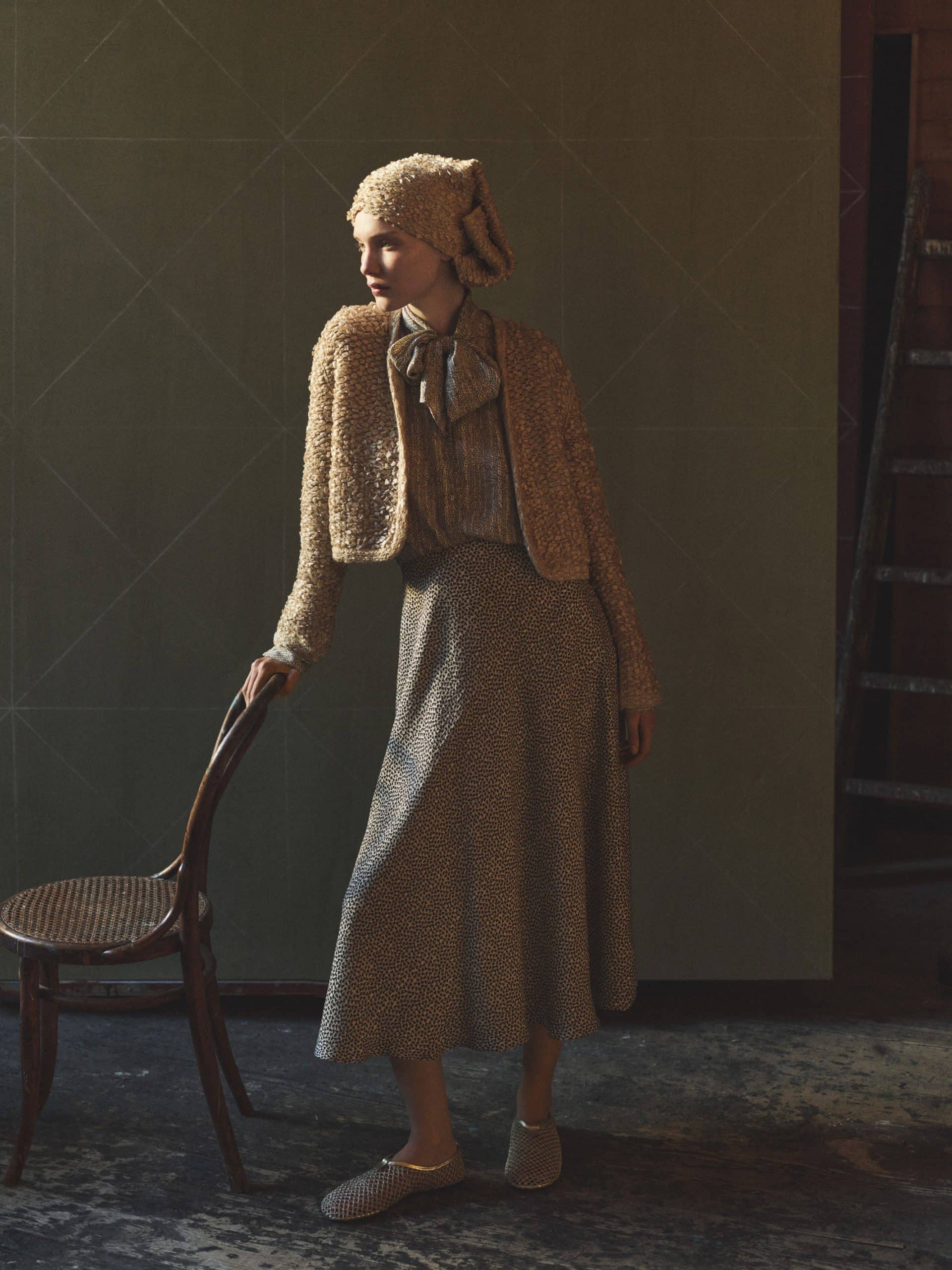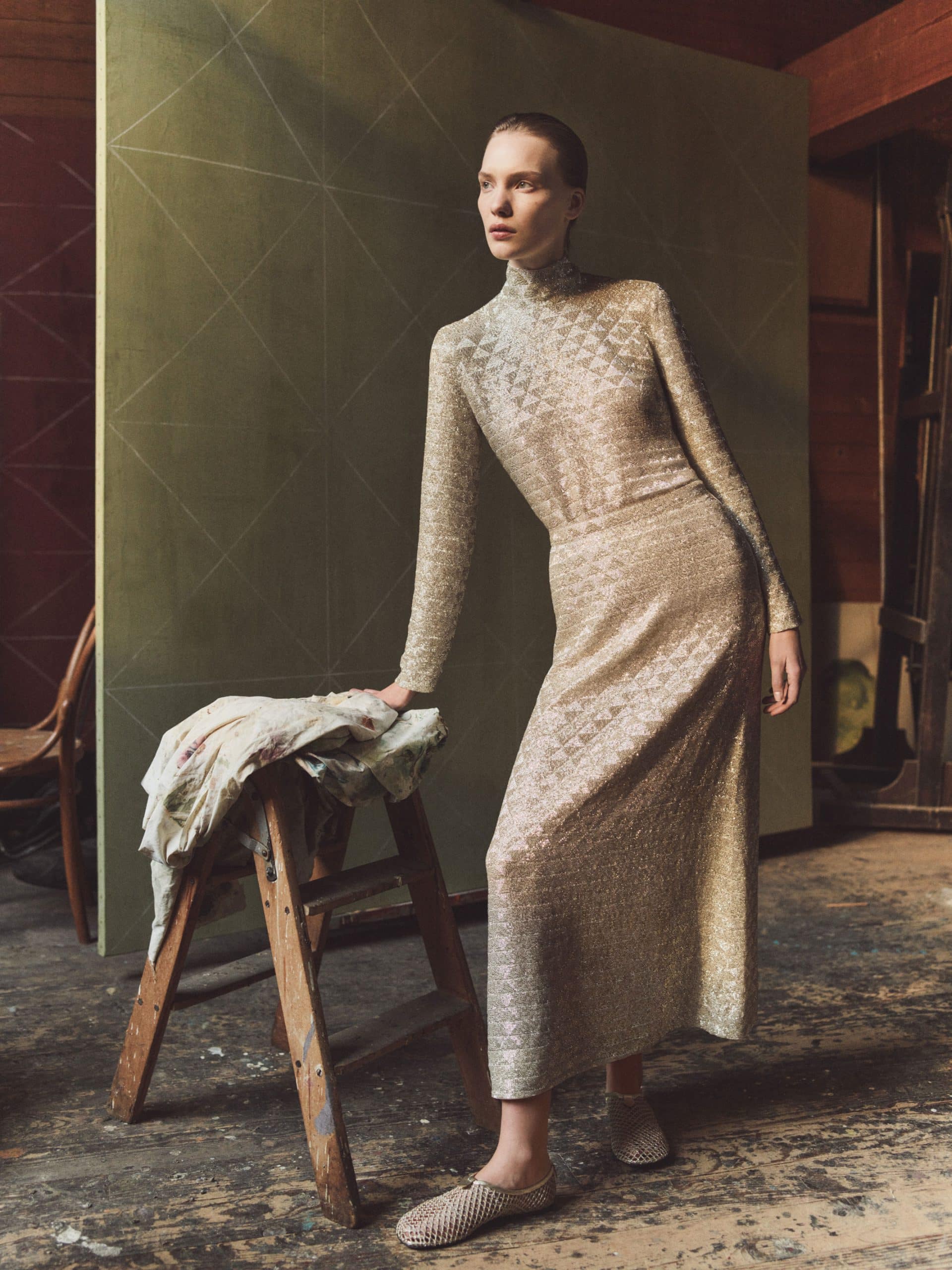 Baby cashmere coats and capes add featherlight warmth and structure, complemented by silk velvet and Light mireille fabrics that create fluid draping balanced by precise tailoring.