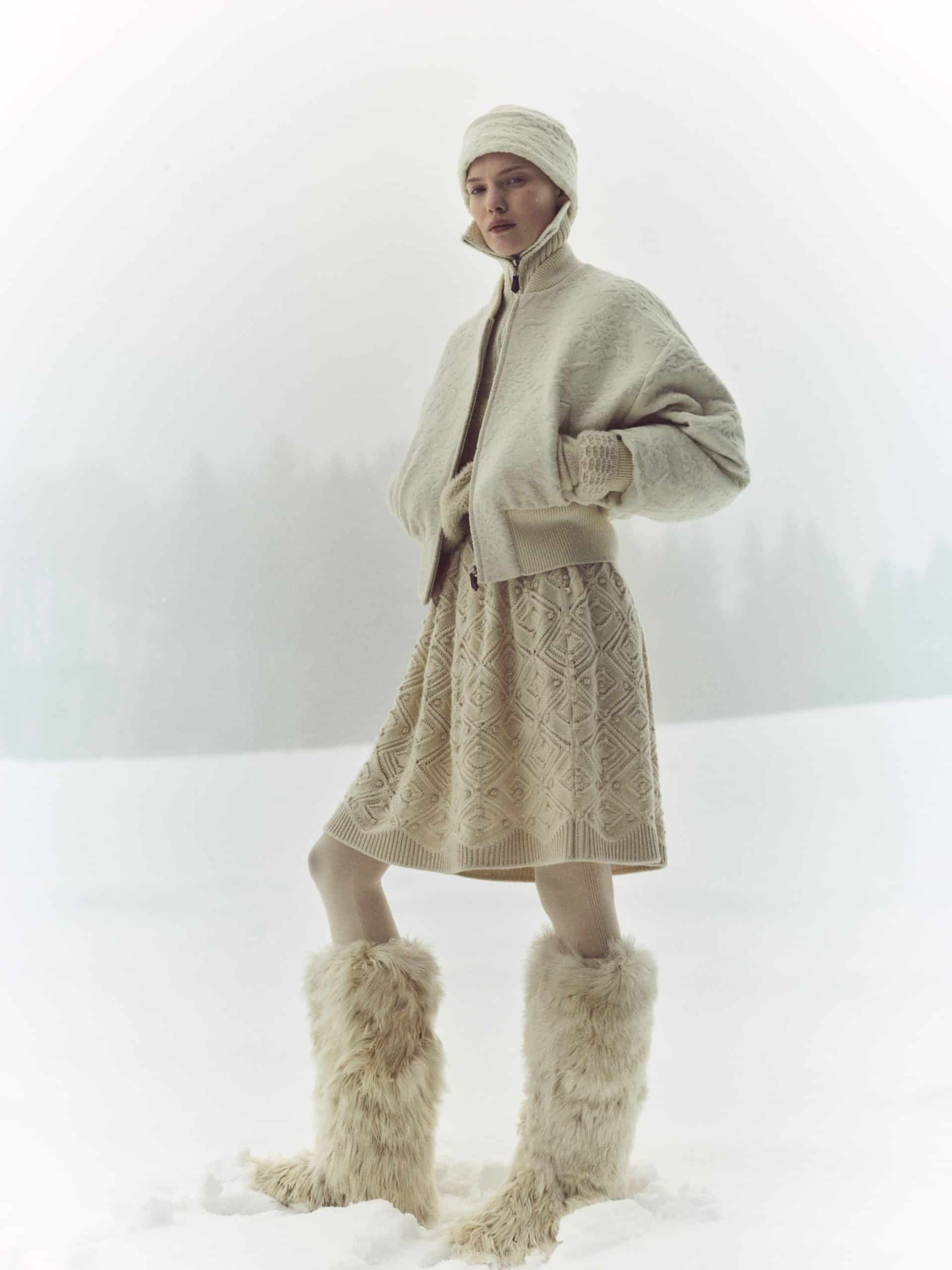 Inspired by Les Arcs’ snowy peaks, the ski and après-ski line blends technical performance with artisanal craftsmanship, spotlighting pieces like the Icer jacket, Spagna jacket, and Traveller, crafted in Cash Storm, Capra Cashmere, and Curly Fur. Layered white-on-white looks and snowflake jacquard patterns enhance the alpine mood.