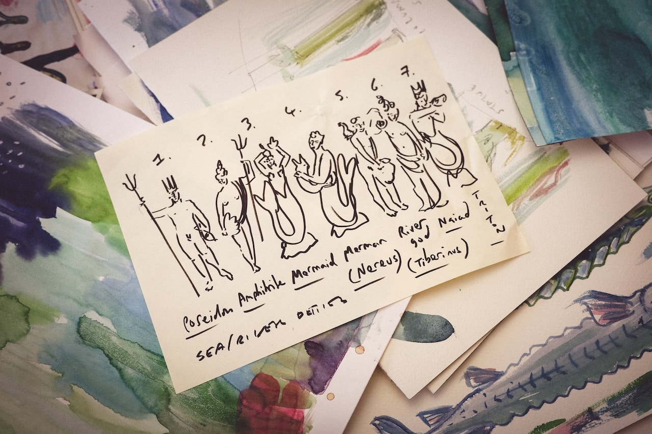 Pre-immersion, Buccellati sets the scene with Roman mythological figures – Neptune, the Naiads, Tiberinus, god of the Tiber, and the sirens – welcoming you into the underwater world. Watercolored by English artist Luke Edward Hall, you’ll soon realize this is only the tip of the iceberg as Italian sturgeons arrive to guide you through the rest of the journey.